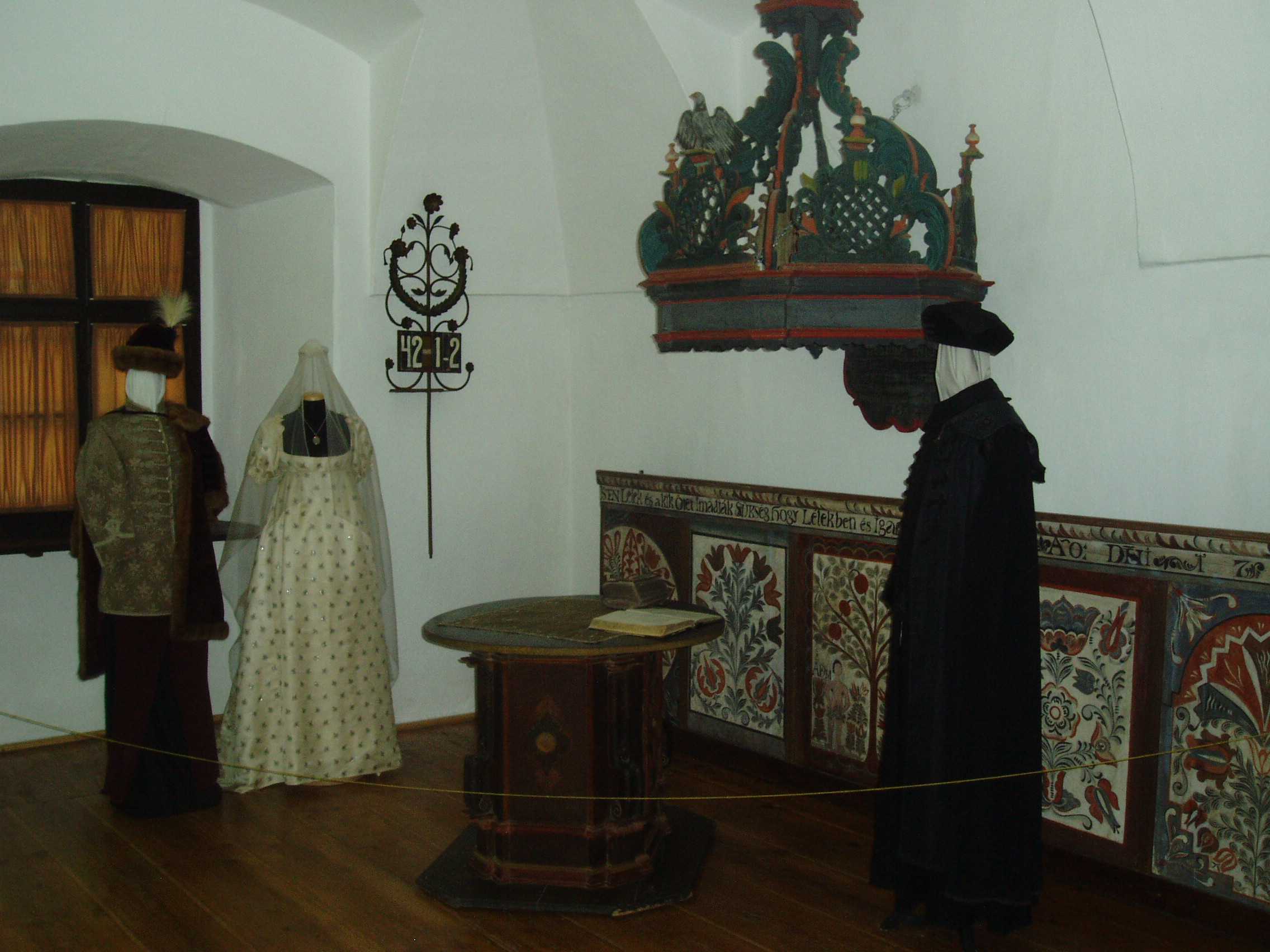 Nyilvános 1093 | 1585 | Sárospatak, Rákóczi utca 1. Református Kollégium | A Kollégium főépületének szárnyai által határolt tágas udvarban áll a régi iskolaépületek utolsó maradványa, az ún. Berna-sor. 1771/72-ben a fizika oktatása számára és a fizikaprofesszor lakásául épült. Az egyemeletes, hosszú szárny déli oldalát később kétszintes, árkádos tornáccal bővítették, feljáróval a nyugati oldalon. Az épület a korabeli provinciális magyar építészet szép példája. Az emelet boltozott termeiben a kollégium történetét bemutató kiállítást rendeztek be. A képen az egyházművészeti gyűjtemény legszebb darabjai láthatók, egy korabeli esküvőt rekonstruálva. A fénykép 2007 augusztusában készült. Felh. irod.: Détsy Mihály: Sárospatak. Bp. Corvina, 1974 |