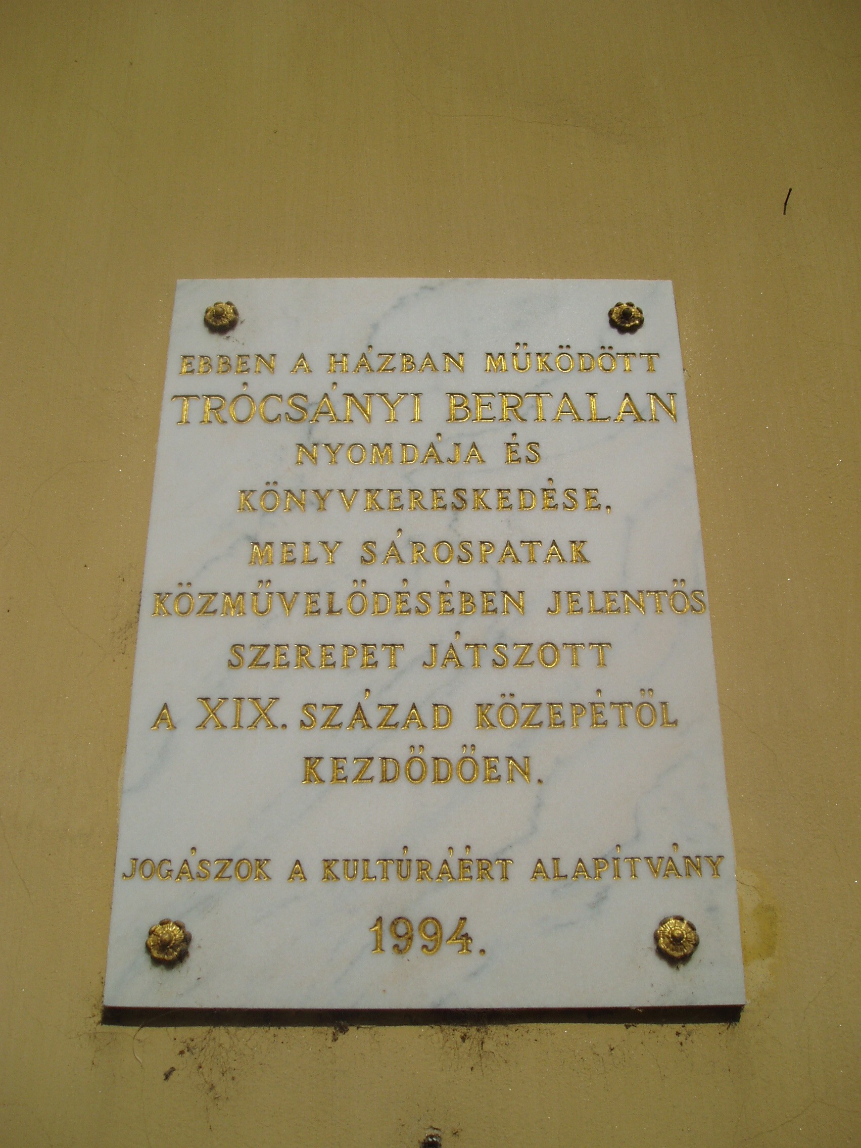 Nyilvános 1034 | 1418 | Sárospatak, Rákóczi utca 6. | A barokk stílusú épület hajdan a közeli Református Kollégium (lásd: Sárospatak, Rákóczi u. 1.) ún. kisinternátusa volt. A XX. század elején a benne lakó első éves joghallgatókról és teológusokról a diákok Gólyavárnak nevezték. Korábban ugyanebben a házban lakott Tompa Mihály, aki 1832 és 1844 között, és Gárdonyi Géza, aki az 1874/75-ös tanévben volt pataki diák. A XIX. század második felétől itt működött Trócsányi Bertalan nyomdája és könyvkereskedése, amely jelentős szerepet játszott Sárospatak közművelődésében. A fénykép 2007 augusztusában készült. Felh. irod.: Látnivalók Borsod-Abaúj-Zemplén megyében. Miskolc, Well-PRess, 1995 Erős Zoltán: Magyar irodalmi helynevek A-tól Z-ig. Bp. Kis-Lant Kiadó, 1995 |