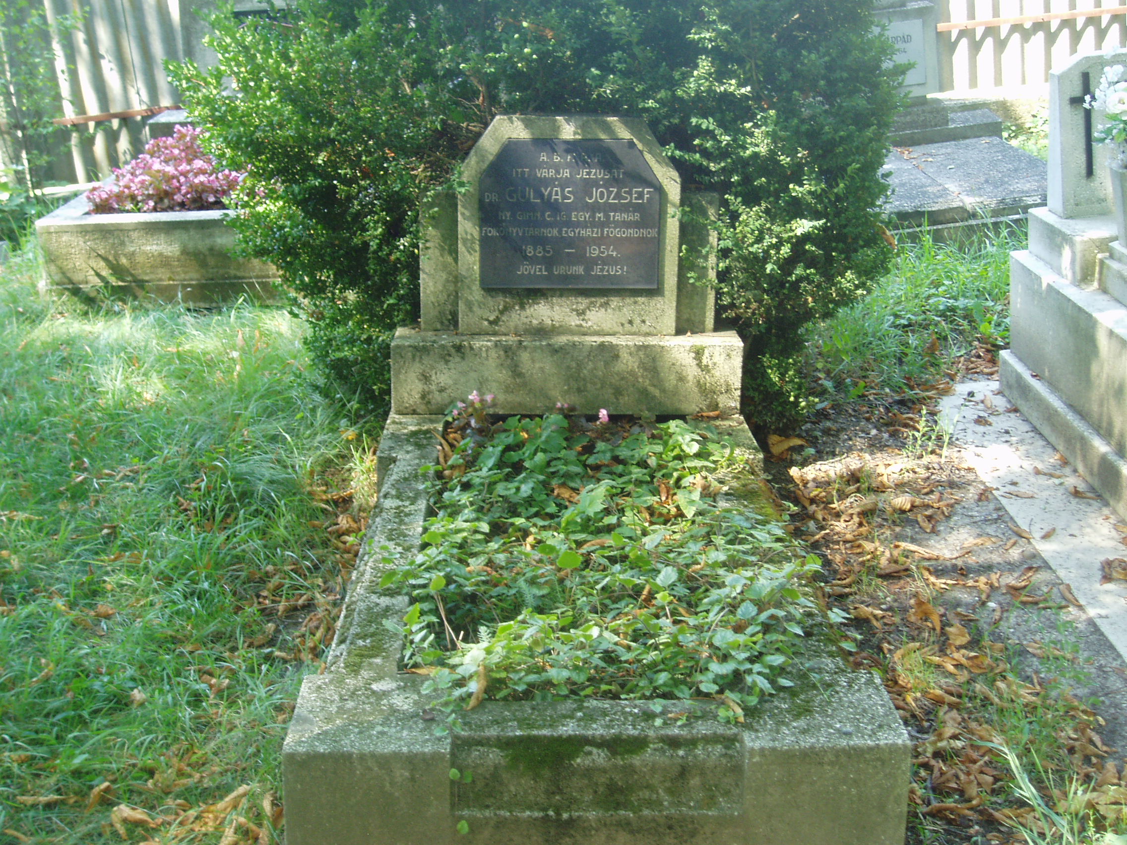 Nyilvános 1115 | 1794 | Sárospatak, Vörösmarty utca: Református temető. Gulyás József sírja | A reformátusok 1780-ban megnyitott temetőjében a Református Kollégium (lásd: Sárospatak, Rákóczi u. 1.) számos kiváló professzora nyugszik. Itt van a sírja Gulyás Józsefnek (1885-1954) is, aki mint a kollégium könyv- és kézirattárának vezetője fontos szerepet vállalt az ott őrzött értékes anyag közkinccsé tételében. Ebben a temetőben nyugszik Cs. Szabó László (1905-1984). Életrajzilag nem kötődött Patakhoz, de végakarata az volt, hogy itt nyugodhasson. Londoni könyyvtárát is a Kollégiumnak adományozta (lásd: Sárospatak, Rákóczi u. 1. Repositorium). (Sajnos, amikor ott jártam, se az ő, se Erdélyi János professzor sírját nem teláltam meg - K.K.). A fénykép 2007 augusztusában készült. Felh. irod.: Látnivalók Borsod-Abaúj-Zemplén megyében. Miskolc, Well-PRess, 1995 |