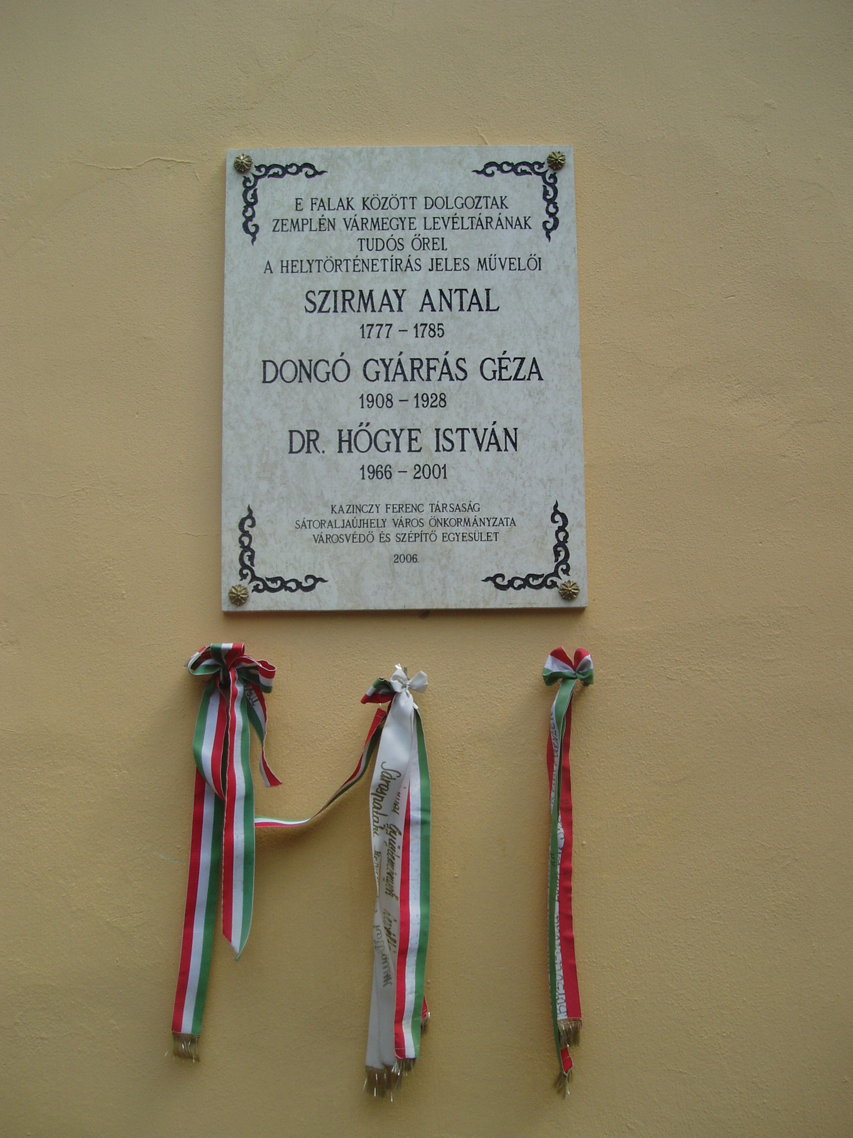 Nyilvános 1040 | 1610 | Sátoraljaújhely, Kossuth tér 5. | A városháza (volt megyeháza) a fő tér hangulatát meghatározó barokk stílusban épült 1754-1768 között. Az épület északi szárnyának emeletén helyezték el Zemplén vármegye levéltárát. Berendezése műemlék: az országban szinte egyedülállóan őrzi a XVIII-XIX. századi "levelestárak" hangulatát. Az épület utcai homlokzatán - Kazinczy Ferencé mellett - ott láthatjuk a levéltár hosszú múltja három jeles alakjának közös emléktábláját. Szirmay Antal (1747-1812) történetíró alakította ki az iratok elhelyezésének logikai rendjét. Ő 1777 és 1785 között dolgozott e falak között. 1908 és 1928 között működött itt Dongó Gyárfás Géza, aki a piarista rendből kilépve állt Zemplén vármegye szolgálatába. Régészettel is foglalkozott, s megírta Sátoraljaújhely történetét. Dr. Hőgye István irodalomtörténész 1966 és 2001 között dolgozott a levéltárban, s feldolgozta nagy elődei itteni működését is. A városháza hivatali időben, a levéltár bejelentkezéssel látogatható. A fénykép 2007 augusztusában készült. Felh. irod.: Látnivalók Borsod-Abaúj-Zemplén megyében. Miskolc, Well-PRess, 2003 http://tokaj-turizmus.wplanet.hu/irodalmiut/_Toc108758785 www.satoraljaujhely.hu/nevezetessegek www.vendegvaro.hu Magyar életrajzi lexikon |