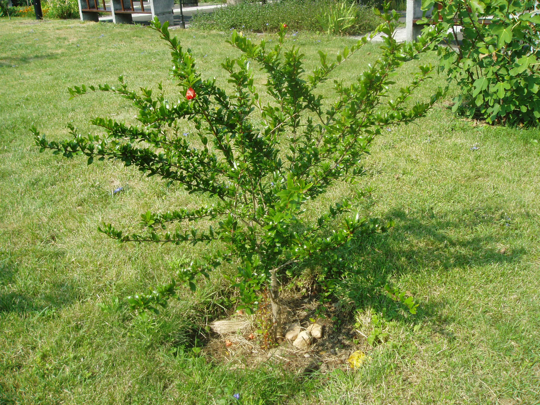 Nyilvános 1080 | 1586 | Sárospatak, Rákóczi utca 1. Református Kollégium | A Kollégium udvarán, a Berna-sor előtt alakították ki a Bibliai kertet. Mintegy ötven féle, a Bibliában említett növény található itt. Az eligazodást alaprajz és a növények jegyzéke segíti. A képen egy kis gránátalmafa látható. A fénykép 2007 augusztusában készült. |