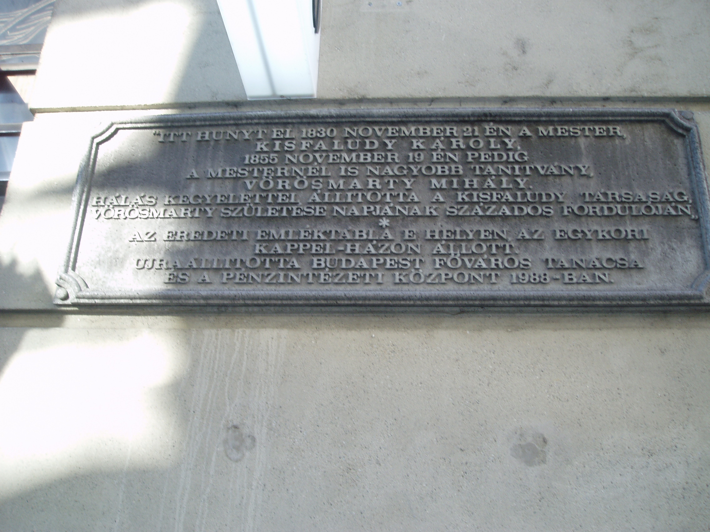 Nyilvános 1118 | 1746 | Budapest, V. Váci utca 19. | A mai irodaépület helyén egykor az ún. Kappel-ház állott (a második világháborúban bombatalálat érte, megmaradt részét az 1960-as években bontották le). A Kappel-házban hunyt el 1830. november 21-én Kisfaludy Károly, majd negyedszázaddal később, 1855. november 19-én Vörösmarty Mihály. Mindkettejüket az udvaron ravatalozták föl. Már az eredeti Kappel-házat is megjelölték a két költő közös emléktáblájával. Az irodaépület elkészülte után azonban új emléktáblát tettek a házra - igaz, az eredeti szöveggel. 2003-ban azonban Ráday Mihály felfedezte az épségben maradt eredeti emléktáblát a Kiscelli Múzeumban, s lépéseket tett, hogy ezt a táblát helyezzék vissza a házra. 2006 őszéig, amikor e fényképet készítettem, javaslata nem vált valóra... Zenei érdekessége is van a helynek: az 1950-es években még állt az eredeti Kappel-ház földszintje, ebben működött a közkedvelt Kedves Presszó. Egyéb lehetőség híján itt zongorázott ekkoriban Cziffra György. Kevéssel ezután külföldön akart szerencsét próbálni, de az AVH elfogta és büntetőtáborba vetette. Csak 1956-ban jutott ki Párizsba, ahol szinte "egycsapásra" világhírű lett. A zongoraművész Ágyúk és virágok címmel írta meg visszaemlékezéseit. A fénykép 2005 májusában készült. Felh. irod.: N. Kósa Judit: Egy békebeli üzenet. = Népszabadság 2006. szept. 16. Erős Zoltán: Magyar irodalmi helynevek A-tól Z-ig. Bp. 1985, Móra Kiadó www.mtv.hu/cikk.php?id=2679 |