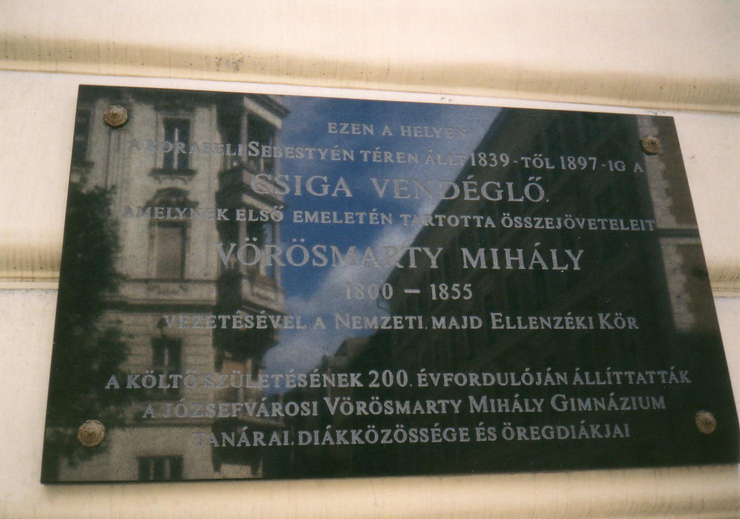 Nyilvános 1233 | 1733 | Budapest, V. Váci utca 38. | Mint a homlokzatán elhelyezett emléktáblán is olvasható, egykor ezen a helyen, az 1930-ig fennállt épületben volt a Csiga vendéglő. Az 1840-es években rendszeresen itt tartotta összejöveteleit a Vörösmarty Mihály körül kialakult baráti társaság, amelyből később kialakult az Ellenzéki Kör. A fénykép 2005 májusában készült. Felh. irod.: Erős Zoltán: Magyar irodalmi helynevek A-tól Z-ig. Bp. Móra Kiadó, 1985 |