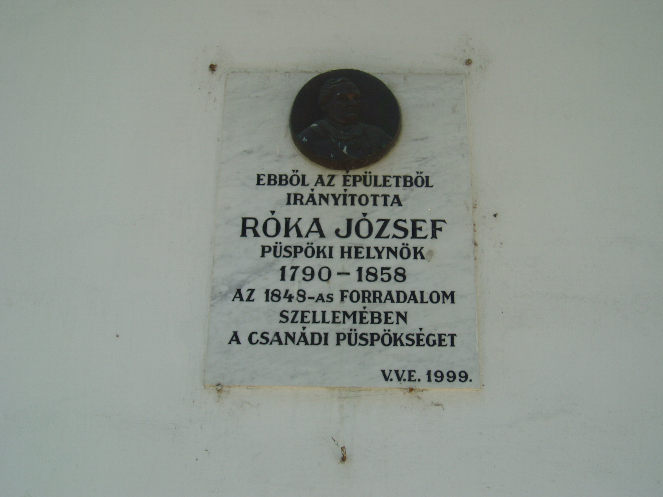Nyilvános 1124 | 1528 | Makó, Csanád vezér tér 12. | A volt püspöki nyaralókastélyt a Temesvárott lakó Kőszeghy László csanádi püspök emeltette 1826-ban a hozzá csatlakozó dór oszlopos kápolnával együtt. A külső homlokzaton jeles, az épülethez kötődő csanádi püspökök, illetve püspöki helynök emléktábláit helyezték el. A képen Róka József (1790-1858) püspöki helynök emléktáblája látható. Az ő elnökletével nyilvánította ki a püspöki szentszék, hogy ők minden világi hatalomtól függetlenek, így a temesvári osztrák városparancsnok utasítását, miszerint tagadják meg a forradalmi kormányt, el nem fogadhatják. A címzetes püspök a püspökség székvárosában, Temesvárott maradt, Róka József pedig a szentszék jegyzőkönyveivel átköltözött Makóra, ahol a környék plébánosaiból létrehozta a szentszéket s innét irányította püspökségét. A szabadságharc bukása után Róka Józsefet kötél általi halálra ítélték, ezt 20 évi várbörtönre változtatták, majd a máriaradnai kolostorba internálták. Ott hunyt el 1858-ban. A fénykép 2007 júliusában készült. Felh. irod.: Barangolások Csongrád megyében. Miskolc, Well-PRess, 1997 Sarnyai Csaba Máté: Határozott kiállás egy történelmi pillanatban. A Csanádi Püspöki Szentszék fellépése az uralkodói manifesztummal és a császárhű temesvári katonai parancsnoksággal szemben 1848 októberében. = Korunk 2002. 7. |
