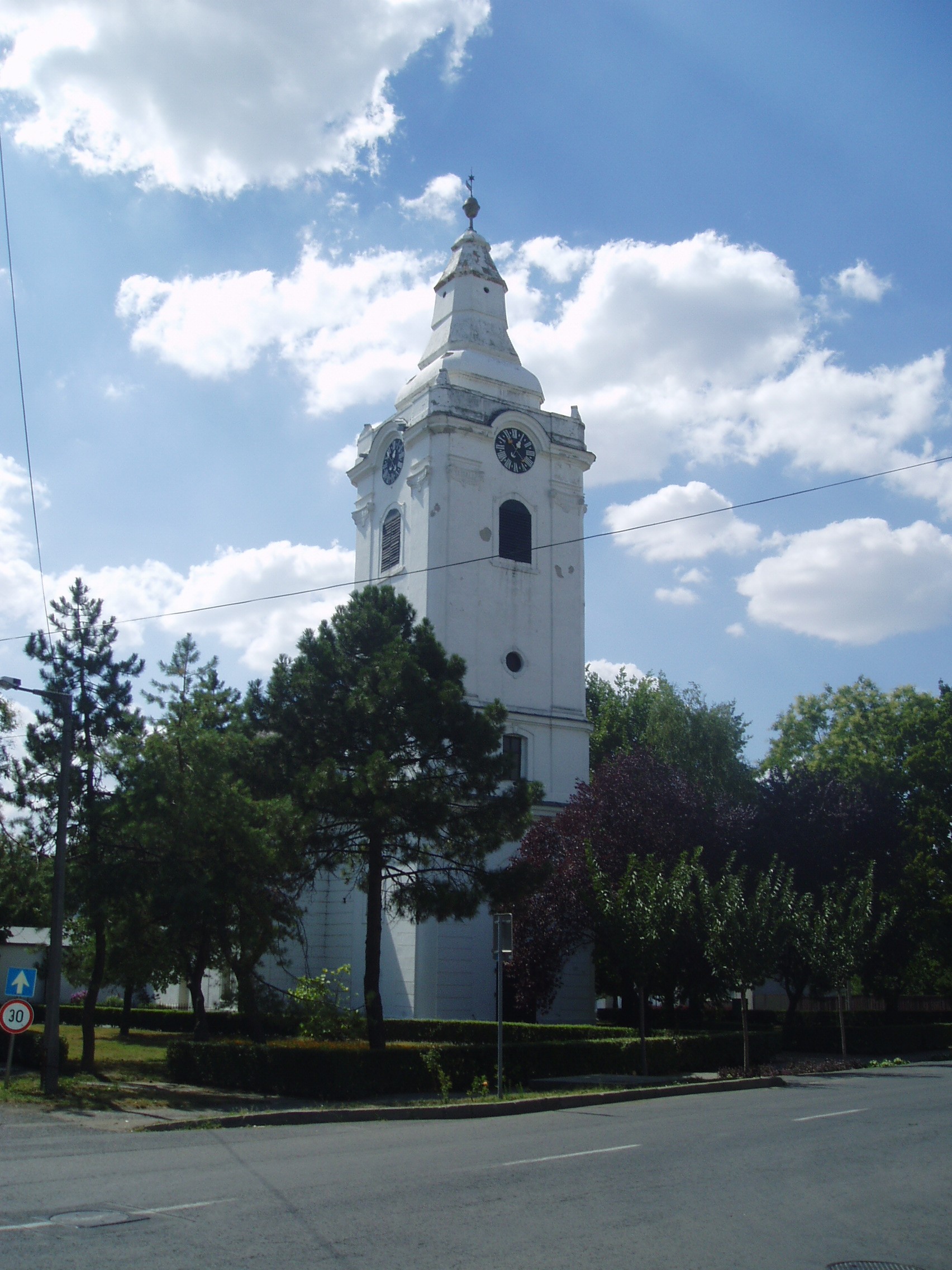 Nyilvános 1066 | 1862 | Makó, Kálvin tér: Református ótemplom | Az 1776-1788 között épült ótemplom 47 méter magas tornyával a vidékies barokk stílus jellegzetes példája. Homlokzatának klasszicizáló elemei és északi harántszárnya az 1828-as átépítés eredménye. Ekkor készült faoszlopokon nyugvó, stukkódíszes mellvédű karzata és orgonája is. A szószék Erdődy Pál, a tölgyfából készült szép padok pedig Joó Sámuel helyi asztalos munkái: füzérdíszei a makói kertekben akkoriban divatos virágokat mintázzák. A fénykép 2007 júliusában készült. Felh. irod.: Barangolások Csongrád megyében. Miskolc, Well-PRess, 1997 |