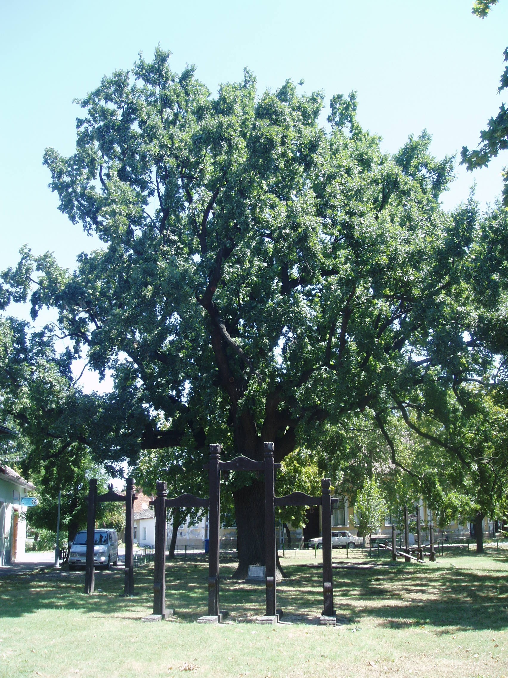 Nyilvános 1087 | 1640 | Makó, Megyeház utca 16. Juhász Gyula-emlékfa | A Megyeház utca 16. számú ház előtti kis parkban áll a Juhász Gyula-emlékfa. A másfél méter törzsátmérőjű kocsányos tölgyet az 1810-es években ültették. Juhász Gyula gyakran kereste fel makói tartózkodása idején. A fénykép 2007 júliusában készült. Felh. irod.: Barangolások Csongrád megyében. Miskolc, Well-PRess, 1997 |