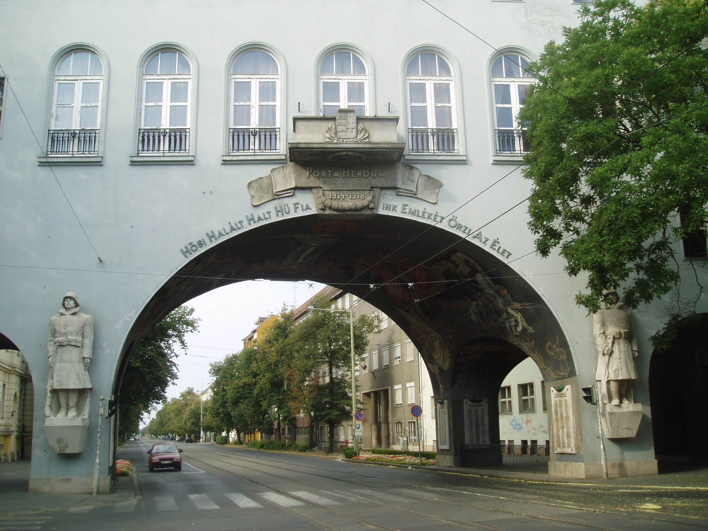 Nyilvános 1141 | 3433 | Szeged, Aradi vértanúk tere: Hősök kapuja | Az Aradi vértanúk tere déli oldalát a nagyszabású Hősök kapuja (Porta heroum) határolja. Az 1936-ban Pogány Móric tervei szerint épült kapu épült kapu honvédszobrai - az élő és a halott katona - Lőte Éva 1937-ben készült alkotásai, s az I. világháború áldozataira emlékeztetnek. A boltív freskóit Aba-Novák Vilmos készítette. A festményeket 1949-ben levakolták, csak a Millenniumra sikerült feltárni és helyreállítani őket. A művész a képsorozaton három témát jelenített meg: a háborús emlékezést, a hősi halottak dicsőítését és Horthy Miklós elindulását Szegedről. Középen, fejjel a tér felé Aba-Novák az ítélkező Krisztus mintegy 8 méteres alakját ábrázolta, lábainál a harsonás, ítélkező angyalok csoportjával. A kapu alatt kezdődik a nagyállomásra vezető Boldogasszony sugárút. A fénykép 2007 júliusában készült. Felh. irod.: www.vendegvaro.hu |