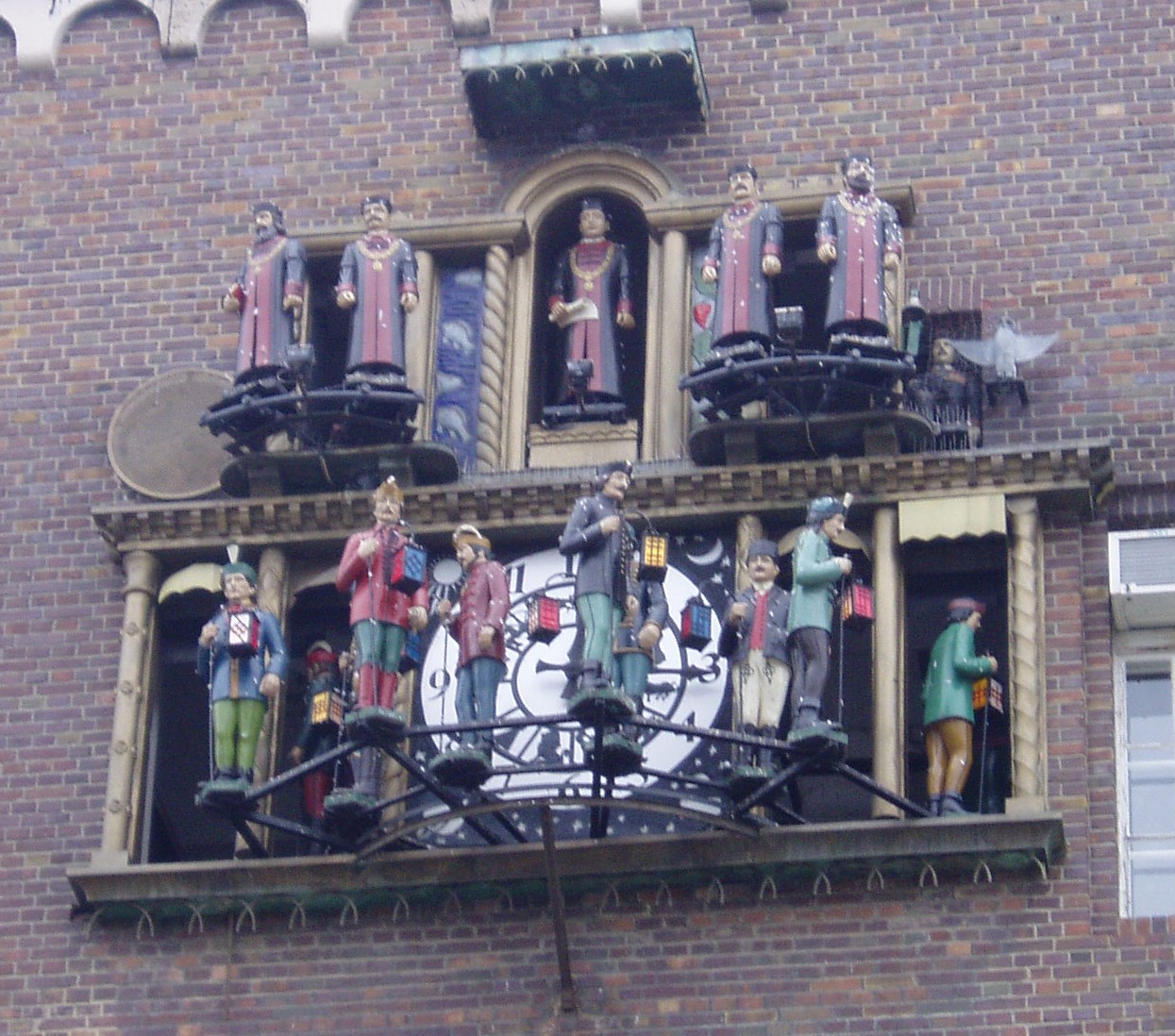 Nyilvános 1067 | 2276 | Szeged, Dóm tér: Zenélő óra | A Dóm teret körülvevő egyetemi épület déli homlokzatán látható a Magyarországon egyedülálló zenélő óra, a középkori egyetemek egyik jelképe, amelyet Csuri Ferenc (1893—1959) órásmester és Kállay József faszobrász készített 1935-ben. A számlap körüli falnyílásokon az egyetemi tanácsot és a ballagó diákokat ábrázoló színes figurák vonulnak ki a Vaszy Viktor által feldolgozott Gaudeamus igitur zenéjére. A szobrocskák olyan híres emberek arcvonásait viselik magukon, mint Klebelsberg Kunó — rektorként, Brassai Sámuel, Mikes Kelemen, Petőfi Sándor, Csokonai Vitéz Mihály, Kazinczy Ferenc és mások — mint diákok. A fénykép 2004 októberében készült. Felh. irod.: Péter László: Szeged. Bp. Panoráma, 1981 www.vendegvaro.hu |