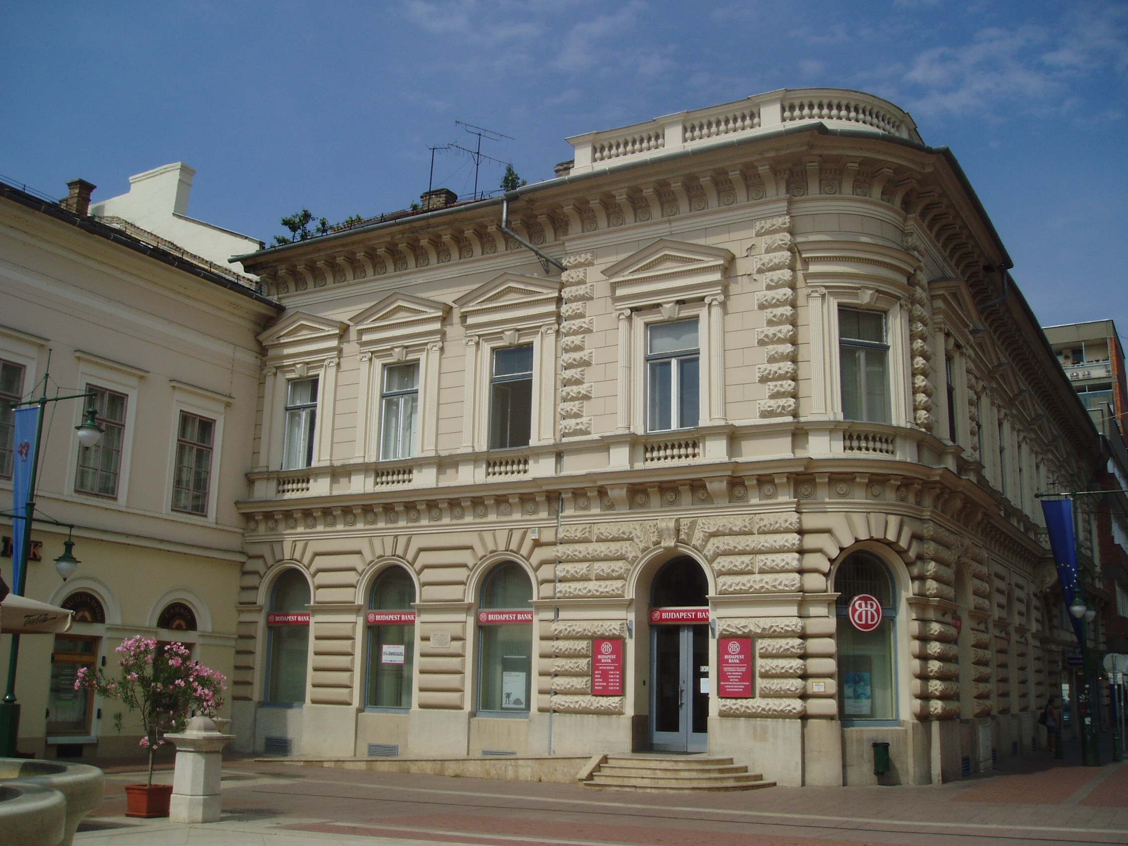 Nyilvános 1047 | 1439 | Szeged, Klauzál tér 4. | A tér nyugati oldalán kiszögellő eklektikus épületben hajdan híres kávéház működött. Tulajdonosa Ströbl József, Tömörkény István anyai nagybátyja volt. A fénykép 2007 júliusában készült. Felh. irod.: Péter László: Szeged. Bp. Panoráma, 1981 |