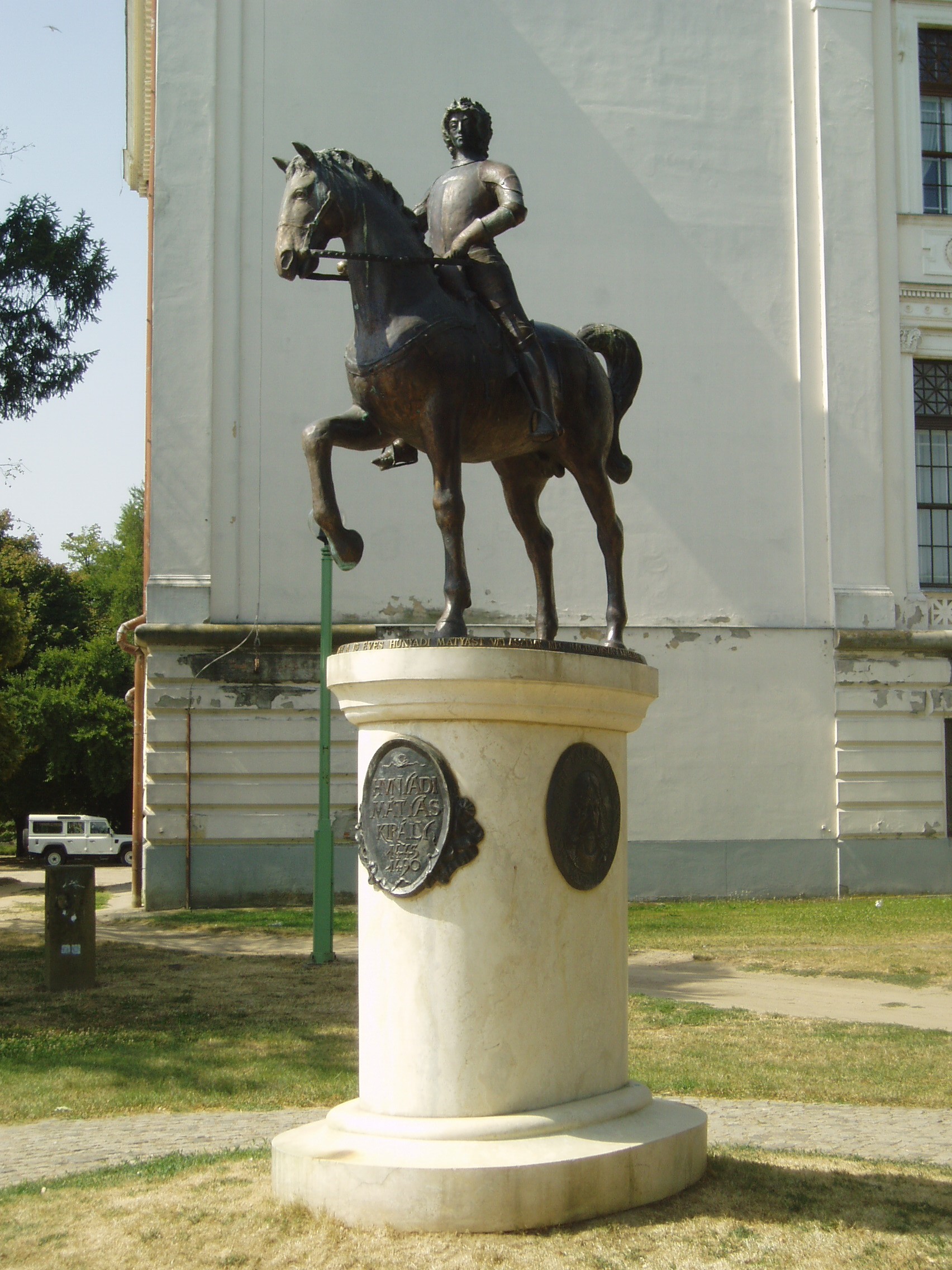 Nyilvános 1169 | 2412 | Szeged, Roosevelt tér: Mátyás király lovasszobra | A Közművelődési palota mögött, az árvízvédelmi fal kiszögellésénél, a Tisza-parton áll a 2001. augusztus 20-án átadott Hunyadi Mátyás lovasszobor, Lapis András alkotása. 1458-ban Szegeden egyeztek meg arról az ország főméltóságai, hogy a 15 éves Mátyást választják meg Magyarország királyának. A szobor talapzatának két oldalán Hunyadi János kormányzó (1407 k.–1456) és Hunyadi László (1431-1457) domborműve látható. A fénykép 2007 júliusában készült. http://users.cwi.hu/idegenvezetés |