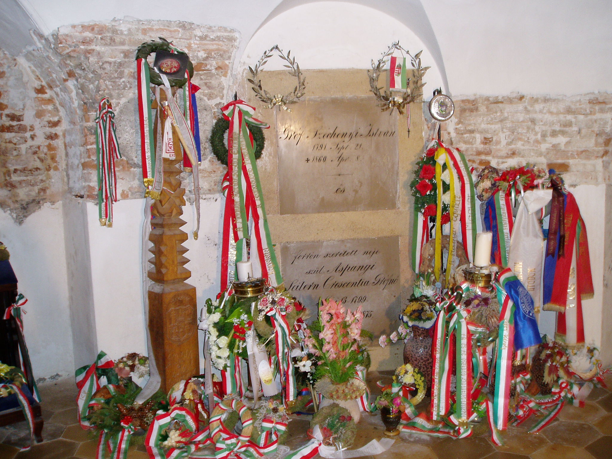 Nyilvános 1492 | 8983 | Nagycenk, Mauzóleum: Széchenyi István és felesége sírja | A Széchényi család nyughelyét a temető létesítésével egyidőben Széchényi Ferenc építtette 1778-ban. A barokk stílusú sírkápolnát 1806-10 között klasszicista előtérrel bővítették. A téglalap alakú előcsarnok kazettás mennyezetét ion oszlopok tartják. Az ovális alaprajzú kápolnát kupola fedi, több kutató véleménye szerint Dorffmeister István freskóival. Innen jutunk a kriptába, a család számos jeles tagjának végső nyughelyére, ahol koszorúszalagok tömege övezi Széchenyi István és felesége, Seilern Crescencia sírkamrájának zárólapját. A fénykép 2005 júliusában készült. Felh. irod.: Látnivalók Győr-Moson-Sopron megyében. Miskolc, Well-PRess, 2000 |
