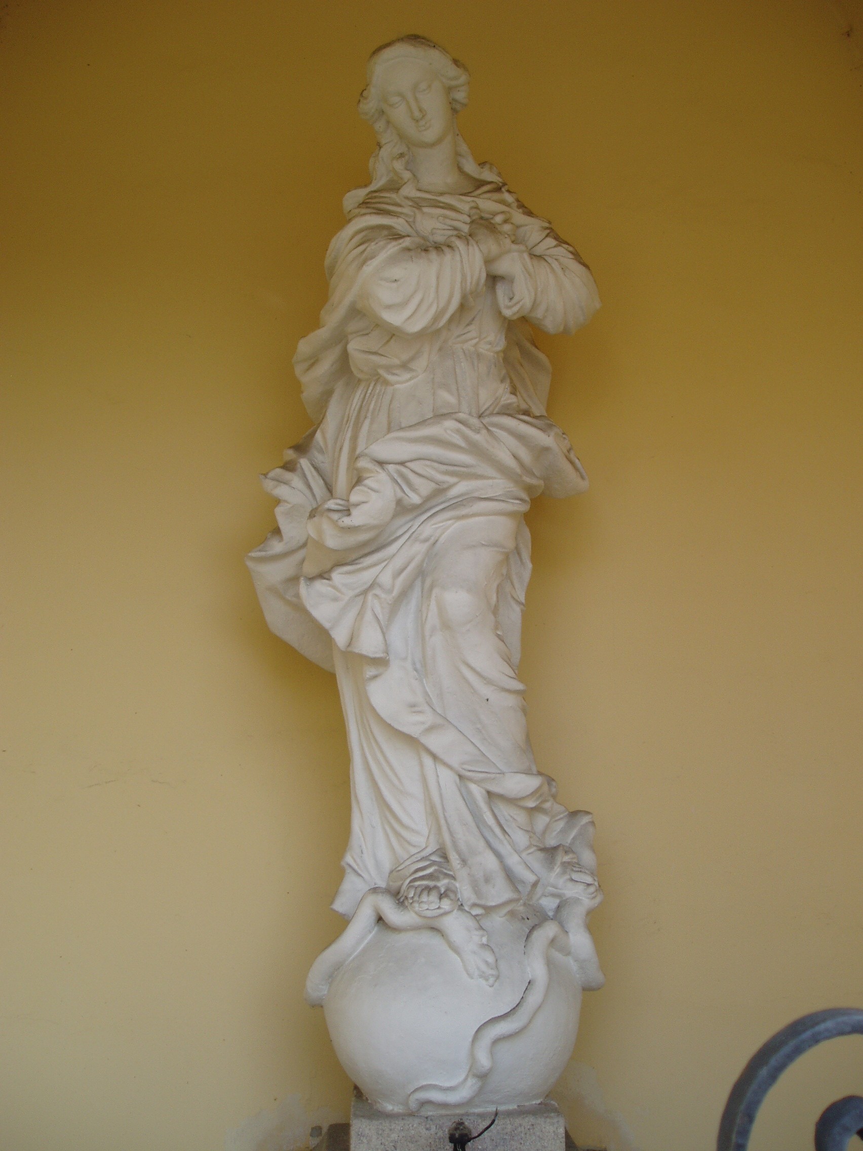 Nyilvános 1127 | 1622 | Győr, Bécsi kapu tér: Karmelita templom | A templomból a főkapun kijövet balról, egy régi oltárfülkében áll a Hab Mária-szobor, amely hozzáértők szerint Győr legszebb barokk szoboralkotása. Eredetileg a Rába szigetén állott árvízi emlékként. A XVII. század közepe óta ismert szobor alkotójának Giovanni Giulianit tartják. A felvétel 2008 május végén készült. Felh. irod.: Cziglényi László: Győr. Bp. Panoráma, 1981 |