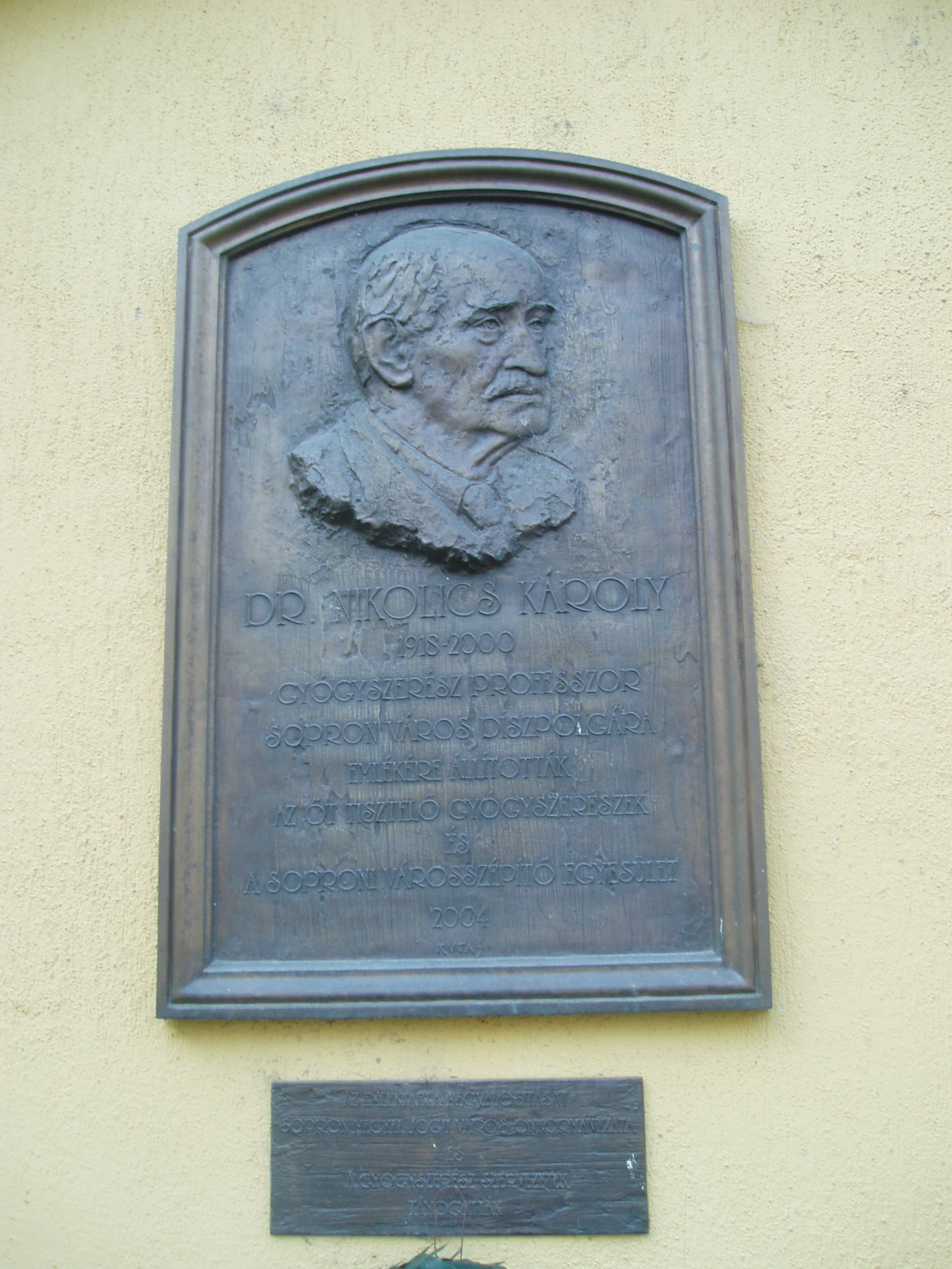 Nyilvános 1034 | 1430 | Sopron, Fő tér 2. | A Patikaház épületén 2004-ben avattak emléktáblát dr. Nikolics Károly gyógyszerészprofesszor emlékére. Sopronban született 1918-ban, gyógyszerész családból. A második világháború után került vissza szülővárosába, ahol folytatta tudományos tevékenységét, kísérleti munkáit. Tudományos publikációi: 9 könyv, illetve továbbképző kiadvány, 150 tudományos közlemény. A kép 2008 júniusában készült. Felh. irod.: www.chemonet.hu/mkl/mkl98/mkl10/nikol.html |