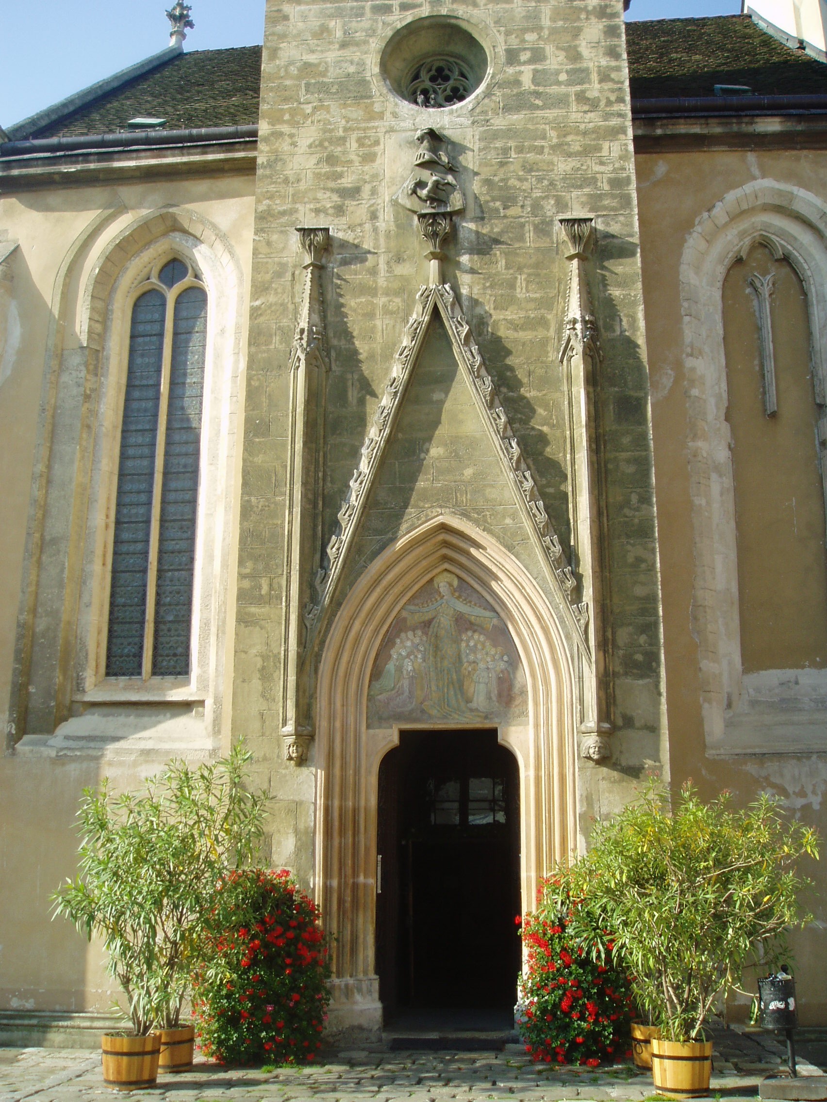 Nyilvános 1328 | 1797 | Sopron, Fő tér: Kecske-templom | A soproni Fő tér ékességét, a gótikus Kecske–templomot és a hozzá tartozó ferences kolostort a XIII. század második felében kezdték építeni. Tornya a XIV. század első negyedében készült el; mai alakja id. Storno Ferenc 1888–1894 között végzett helyreállításának eredménye. Szokatlan nevét a kapuzat felett látható faragott állatfiguráról kapta (a ma látható kecske Storno Ferenc faragványa, az eredeti a Káptalanteremben van), amelyről kiderítették a kutatók, hogy az építtető Gaisel család címerállata volt. Maga a templom faragott kőből épült, háromhajós, északi oldalán toronnyal díszített kora gótikus épület, berendezése a későbbi századokból származó barokk, illetve rokokó stílusú. Déli hajójának közepén áll egy XV. századból származó, márványból készült szószék. Ebbe ágyazták bele azt a fából faragott szószéket, amelyről állítólag Kapisztrán János prédikált a templom előtt a török ellen. A templom többször volt színhelye országos jelentőségű ünnepségeknek, reprezentációs alkalmaknak: 1553 és 1681 között öt alkalommal falai között tartották az országgyűlési ünnepeket; 1625-ben királyt (III. Ferdinánd), 1622-ben és 1681-ben királynét koronáztak benne. 1787-ben feloszlatták a ferences rendet, s az épületegyüttest később a bencések kapták meg. A fénykép 2008 júniusában készült. Felh. irod.: Czellár Katalin: Sopron. 3. jav. kiad. Bp. Panoráma, 2000 Albert Tibor: Sopron–Vas vármegyei útikönyv. Magyar múlt — osztrák–magyar jelen. Kőszeg, Városkapu Kiadó, 2005 |