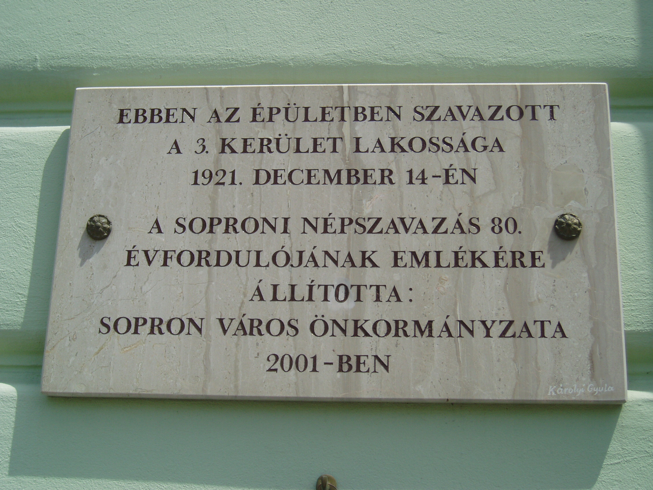 Nyilvános 1045 | 1535 | Sopron, Halász utca 25. | A Petőfi Sándor Általános Iskola falán emléktábla hirdeti, hogy valaha helyén az a kaszárnya állt, amelyben 1839/40 telén katonáskodott Petőfi Sándor. Egy másik tábla arra emlékezik, hogy a mai iskolaépület volt az egyik helyszíne a soproni népszavazásnak 1921. december 14-én. A fénykép 2008 júniusában készült. |