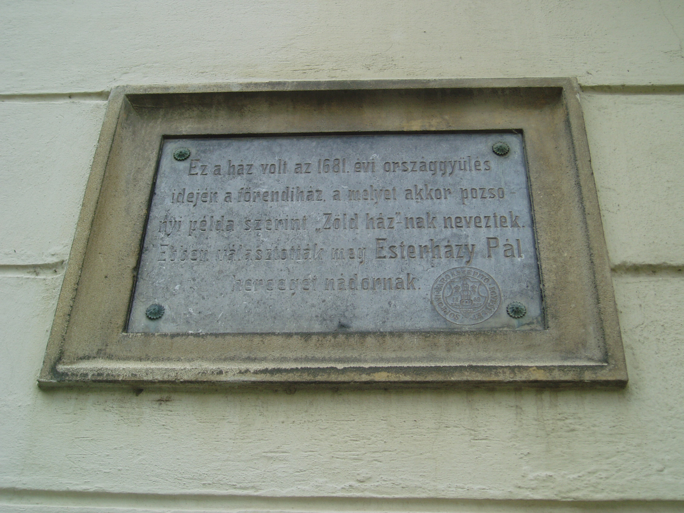 Nyilvános 1023 | 1366 | Sopron, Hátsókapu 2. | Az ún. Caesar–ház hatalmas reneszánsz sarokerkélyével a városkép jellegzetes eleme. Helyén valamikor több kisebb, valószínűleg a XV. században épült lakóház állt. Az 1676-ban Sopron belvárosát sújtó nagy tűzvész után ezek megmaradt részei, valamint a belső városfal maradványainak felhasználásával épült fel e pompás kis városi palota. Dongaboltozatos kapualjában megmaradtak a középkori ülőfülkék. Udvari szárnyának emeletén toszkán oszlopos, köríves árkádsor van. Az udvarból a falszorosban kialakított kertbe juthatunk, ahol látható a római és a ráépült középkori városfal, amelyet ablakokkal áttörve az épület hátsó homlokzataként használtak fel. Két emeleti termében megmaradt az 1700 körül készült, kora barokk ornamentális stukkómennyezet. Az 1681-es országgyűlés idején ebben az épületben ülésezett a főrendiház, ekkor választották Magyarország nádorává Esterházy Pál herceget, aki Harmonia caelestis című kantátasorozatával beírta nevét a magyar zenetörténetbe is. Az eseményt a Soproni Városszépítő Egyesület körpecsétjével ellátott emléktábla örökíti meg az épület homlokzatán. A fénykép 2008 júniusában készült. Felh. irod.: Czellár Katalin: Sopron. 3. jav. kiad. Bp. Panoráma, 2000 |