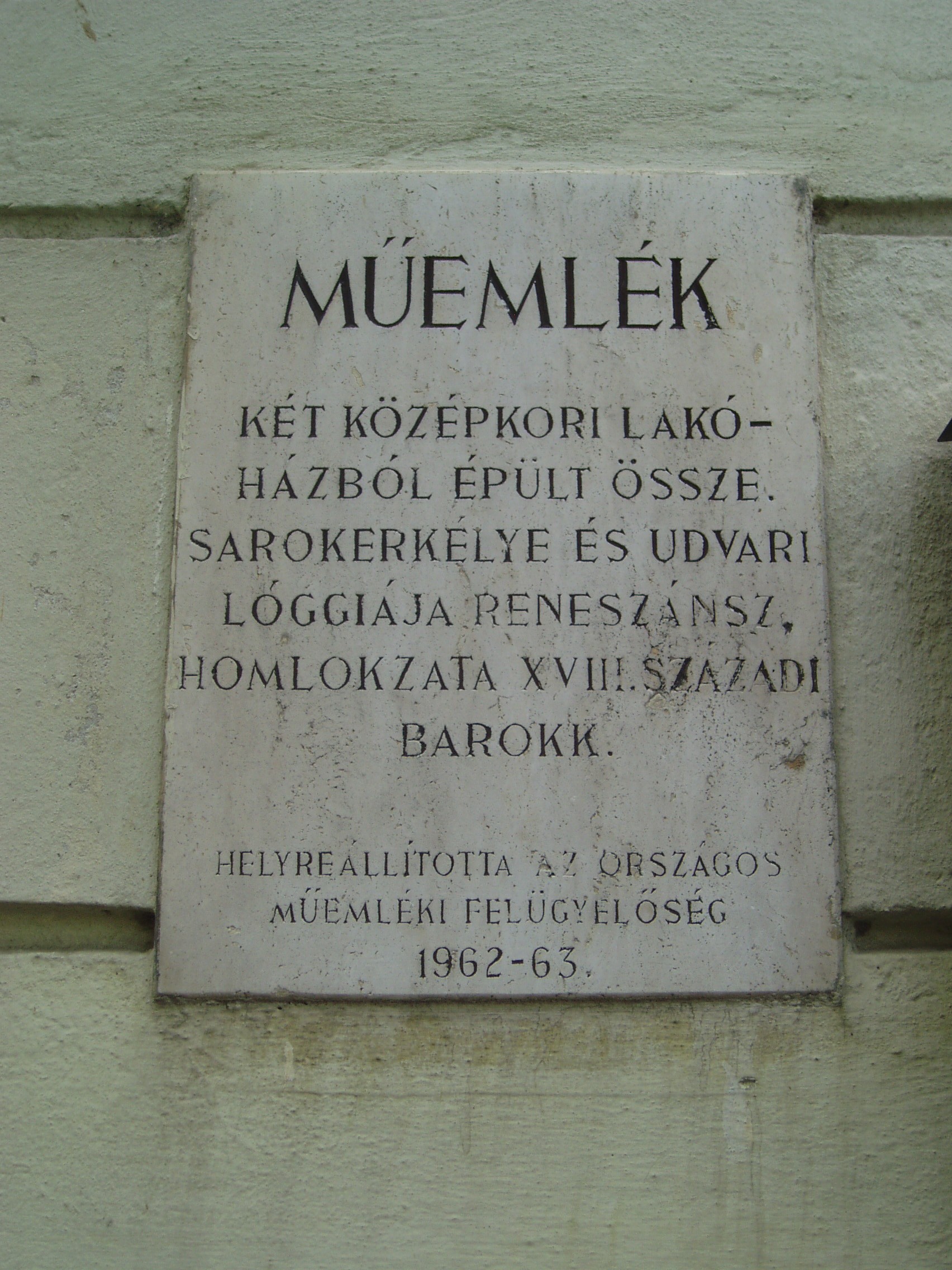 Nyilvános 988 | 1333 | Sopron, Hátsókapu 2. | Az ún. Caesar–ház hatalmas reneszánsz sarokerkélyével a városkép jellegzetes eleme. Helyén valamikor több kisebb, valószínűleg a XV. században épült lakóház állt. Az 1676-ban Sopron belvárosát sújtó nagy tűzvész után ezek megmaradt részei, valamint a belső városfal maradványainak felhasználásával épült fel e pompás kis városi palota. Dongaboltozatos kapualjában megmaradtak a középkori ülőfülkék. Udvari szárnyának emeletén toszkán oszlopos, köríves árkádsor van. Az udvarból a falszorosban kialakított kertbe juthatunk, ahol látható a római és a ráépült középkori városfal, amelyet ablakokkal áttörve az épület hátsó homlokzataként használtak fel. Két emeleti termében megmaradt az 1700 körül készült, kora barokk ornamentális stukkómennyezet. Az 1681-es országgyűlés idején ebben az épületben ülésezett a főrendiház, ekkor választották Magyarország nádorává Esterházy Pál herceget, aki Harmonia caelestis című kantátasorozatával beírta nevét a magyar zenetörténetbe is. Az eseményt a Soproni Városszépítő Egyesület körpecsétjével ellátott emléktábla örökíti meg az épület homlokzatán. A fénykép 2008 júniusában készült. Felh. irod.: Czellár Katalin: Sopron. 3. jav. kiad. Bp. Panoráma, 2000 |