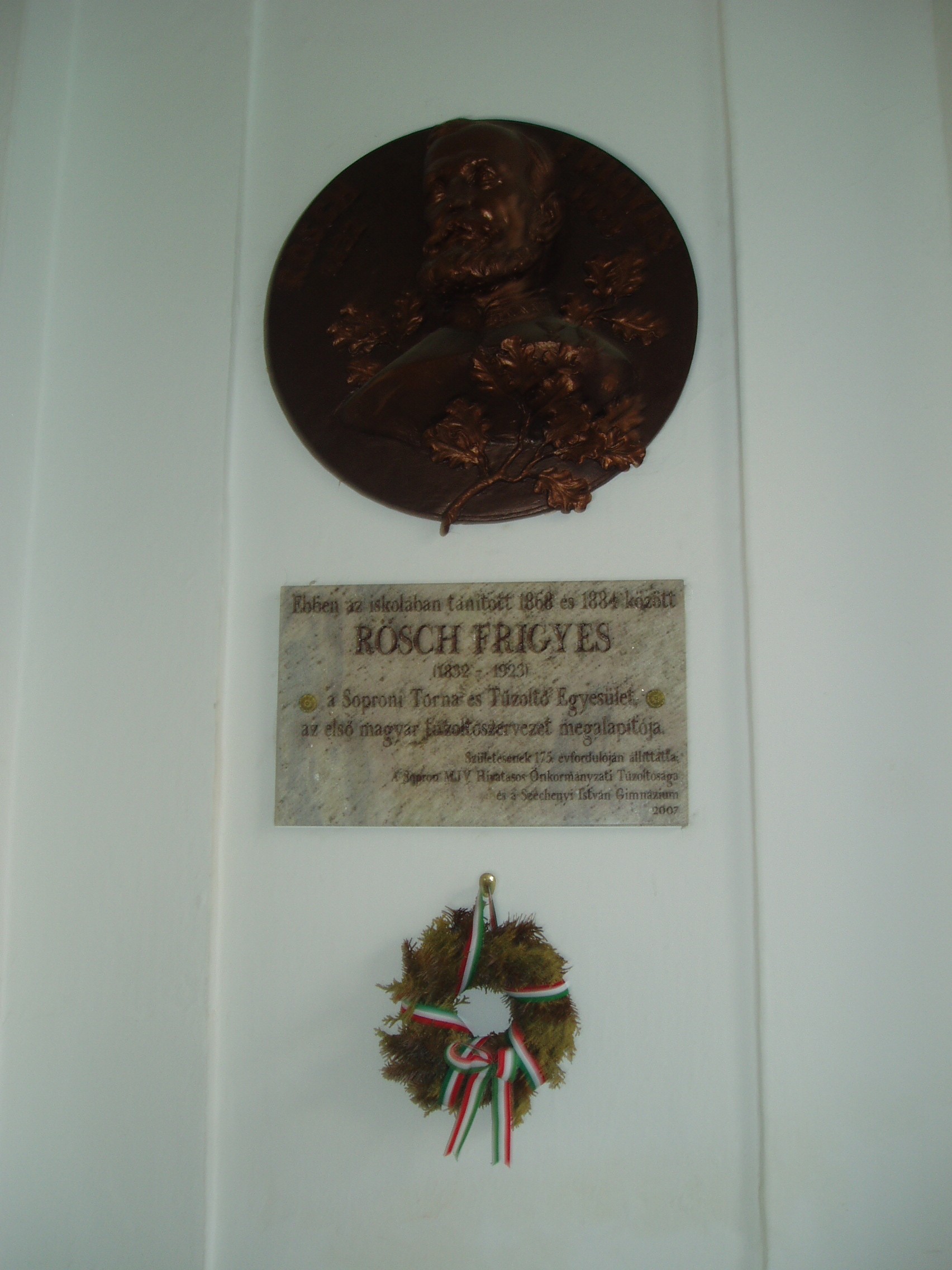 Nyilvános 1108 | 1592 | Sopron, Liszt Ferenc utca 1. | A Széchenyi István Gimnázium eredetileg reáliskola volt, amelyet 1850-ben alapítottak (lásd: Liszt Ferenc utca 2.). A Liszt Ferenc utca sarkán álló épületrészét, amelynek ezen a képen az udvari része látható, 1872-ben építették. A képen látható emléktáblát Rösch Frigyes (1832-1923) emlékére állították, aki 1868 és 1884 között itt tanított. Ő alapította meg a Soproni Torna és Tűzoltó Egyletet. A fénykép 2008 júniusában készült. Felh. irod.: http://szig.sopron.hu/ |