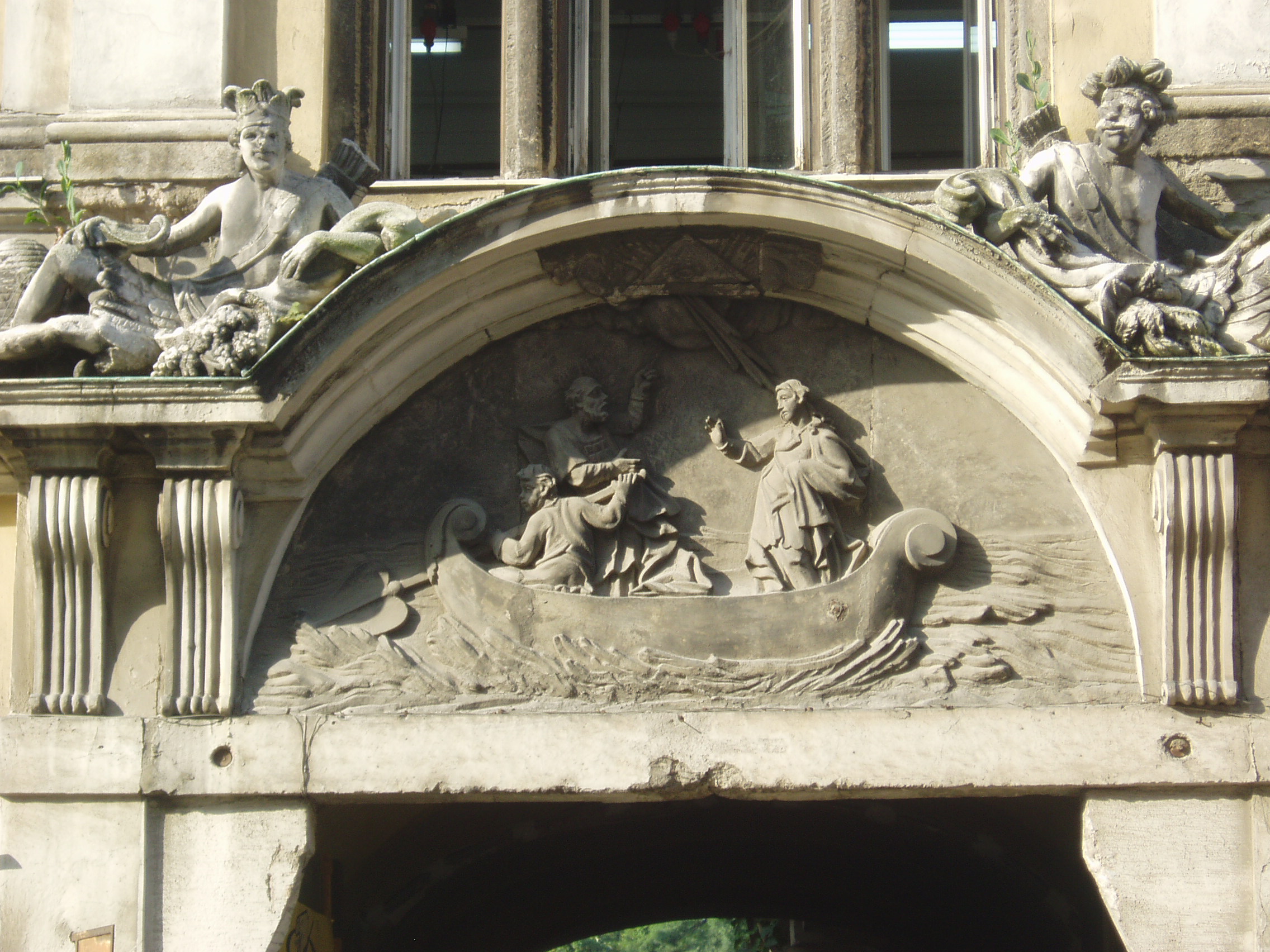 Nyilvános 1030 | 1619 | Sopron, Rákóczi utca 39. | A kétemeletes, klasszicista stílusú lakóház 1816-ban Hild vencel tervei szerint Lenk Sámuel nagykereskedő számára épült gazdag szobrászati díszítésekkel. Az övpárkány és a kapu felett a Lenk kereskedőcsalád cégére, két mór faragott figurája látszik. A kő dombormű a csodálatos halászatot ábrázolja. A kép 2008 júniusában készült. Felh. irod.: Czellár Katalin: Sopron. 3. jav. kiad. Bp. Panoráma, 2000 |