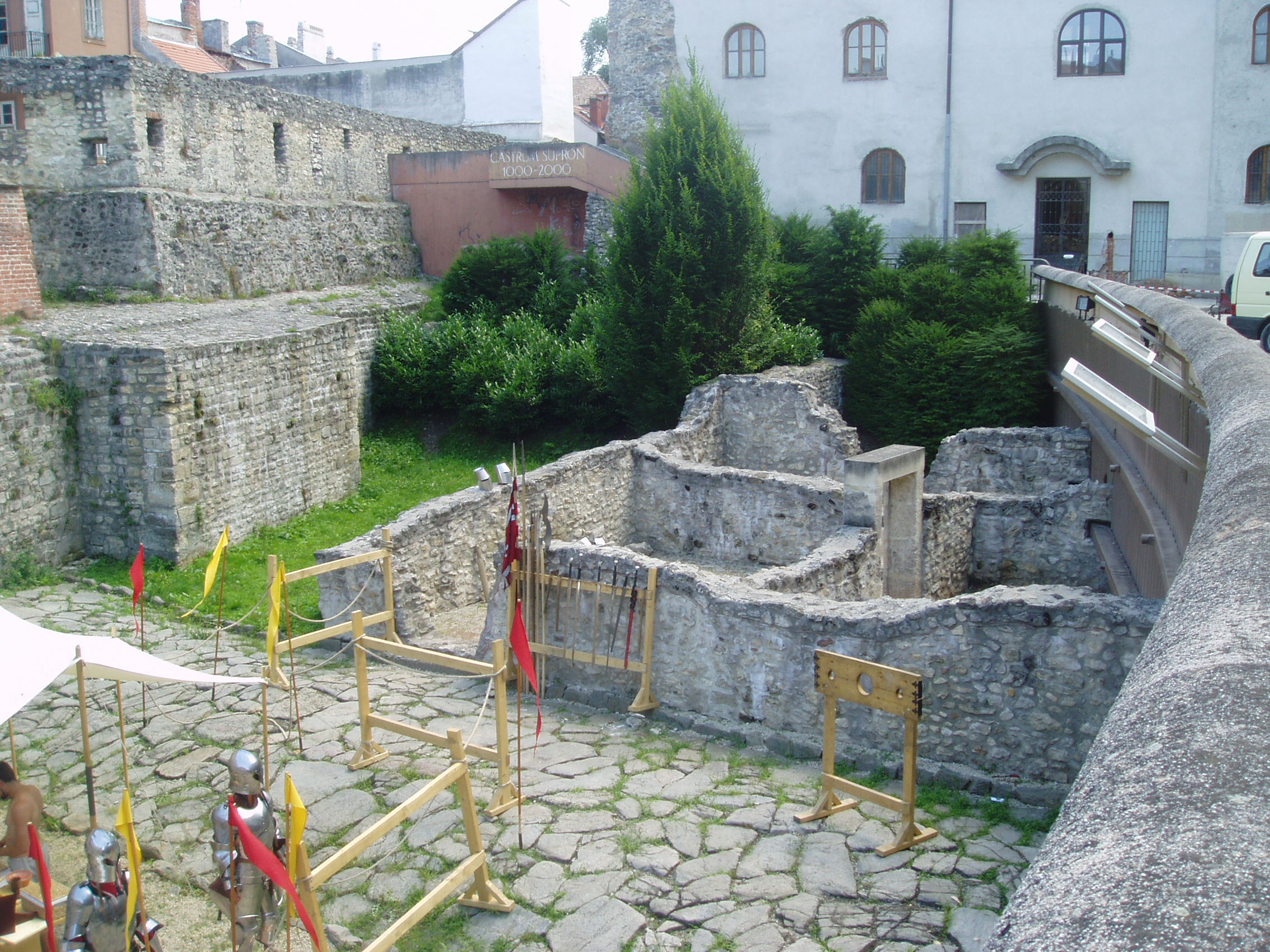 Nyilvános 1031 | 2194 | Sopron, Scarbantia Régészeti Park | Az egykori Római Birodalom Pannónia provinciájának egyik határállomása Scarbantia, a mai Sopron volt. A római oppidum központjának, a fórumnak legfontosabb épületét - a capitoliumi templomot - 1893 telén a városháza építésekor találták meg. Az 1960- és 1970-es évek ásatásaival végül sikerült meghatározni a fórum teljes kiterjedését és elhelyezkedését. A mai belváros szívében feltárt maradványokat - kiegészítve a a XI. századi ispáni vár feltárt sáncával - nagyszabású szabadtéri régészeti kiállítás keretében, térképekkel, ismertetőszövegekkel kellően ellátva szemlélheti meg a városnéző. A kép 2008 júniusában készült. |