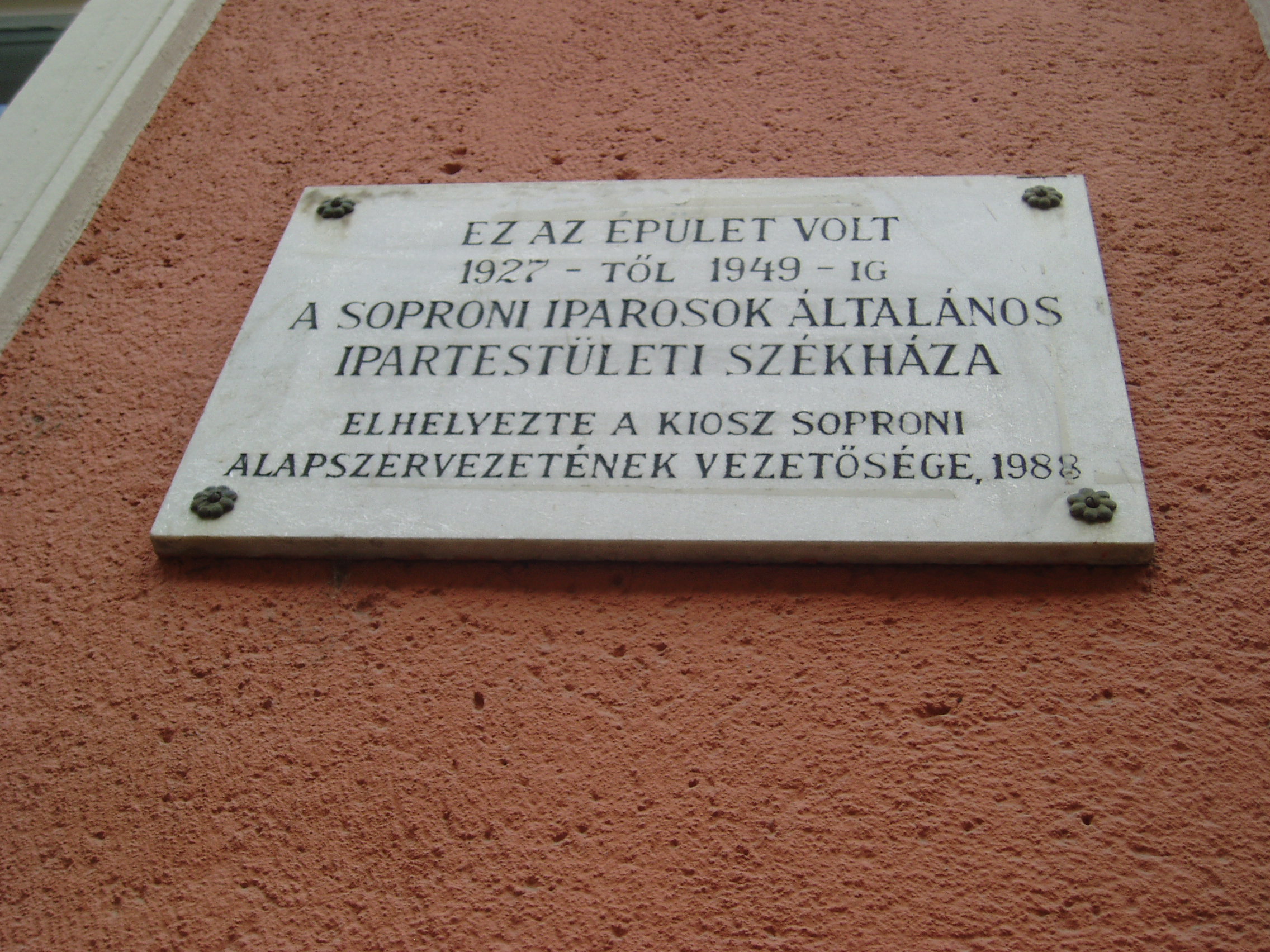 Nyilvános 1013 | 1351 | Sopron, Szent György utca 20. | Ezen a helyen már az Árpád korban lakóház állt, maradványait az épület pincéje rejti, rajtuk két középkori kút található. 1927 és 1949 között ez volt a soproni iparosok Általános Ipartestületének székháza, emeletén a hétablakos nagyteremmel. A kép 2008 júniusában készült. Felh. irod.: Czellár Katalin: Sopron. 3. jav. kiad. Bp. Panoráma, 2000 |