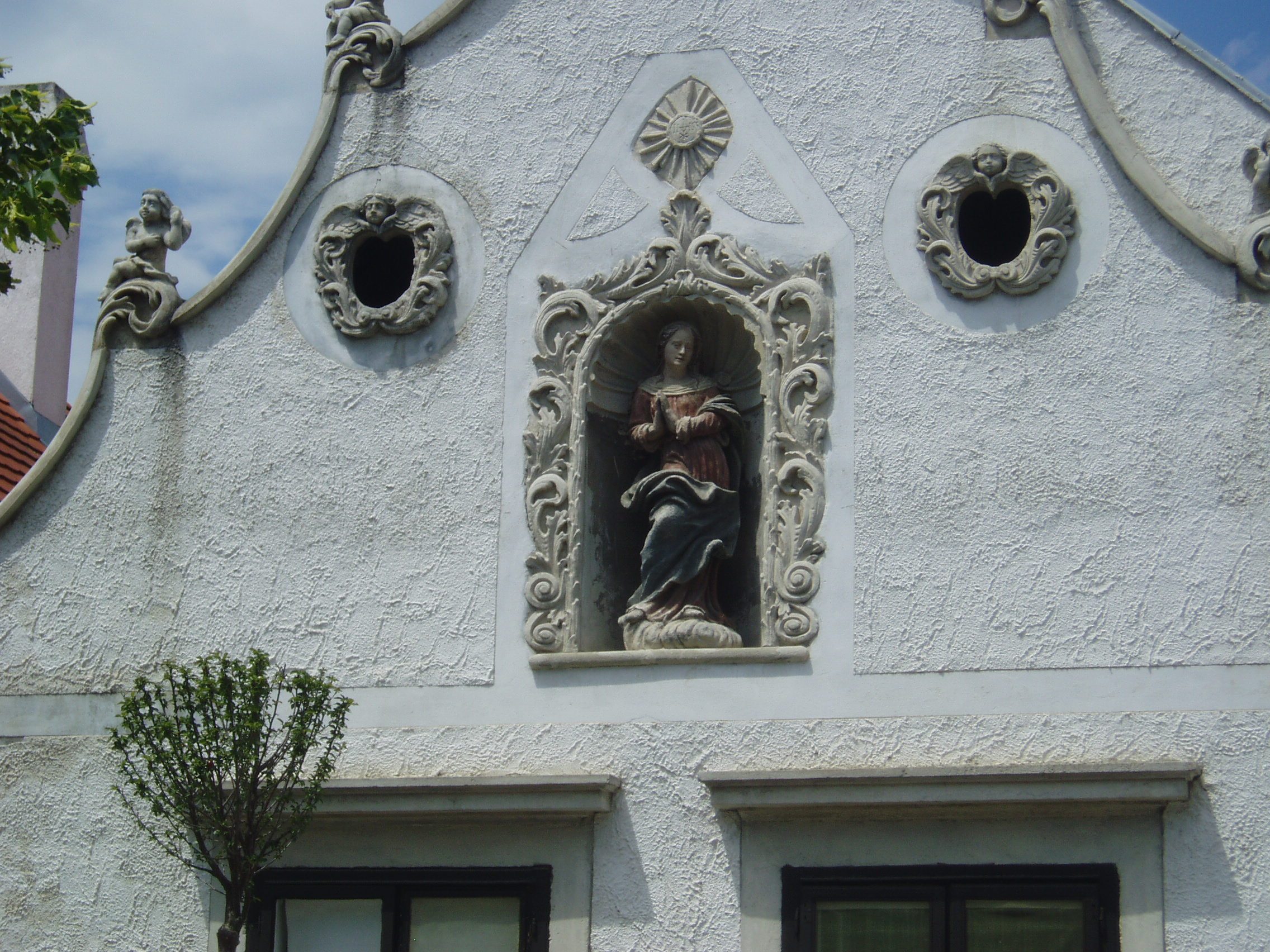 Nyilvános 1025 | 1364 | Sopron, Szent Mihály utca 9. Két mór-ház | Az épület két XVII. századi, oromzatos parasztházból alakult ki az 1700-as évek elején. Ekkor Leitner Szervác szobrász volt a tulajdonosa, aki népies barokk stílusban gazdagon díszítette a homlokzatot. A két házat mozgalmas díszítésű kapu köti össze, melyet két korinthoszi csavart oszlop keretez, a tetején egy-egy mór alakjával. Az oromzatok közepén dús keretezésű fülkében Mária, illetve Szent József szobra áll.A fülkék mellett két kis kerek ablak van, gazdag keretezéssel. Az oromzatok hullámos széleit angyalkák díszítik, csúcsukon Szent Flórián és Szent Rókus feje látható. A kép 2008 júniusában készült. Felh. irod.: Czellár Katalin: Sopron. 3. jav. kiad. Bp. Panoráma, 2000 |