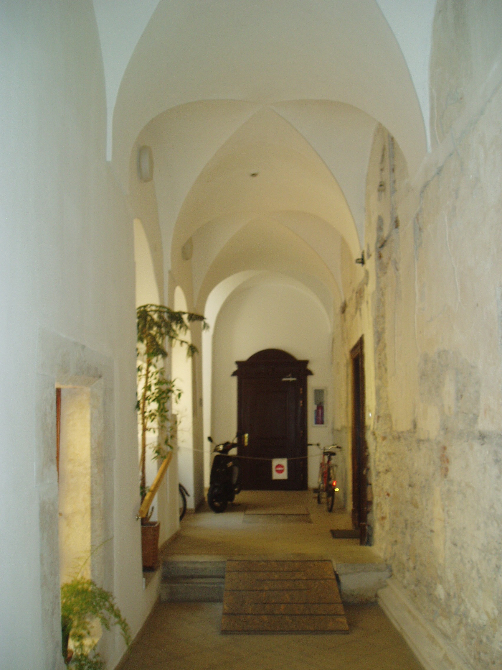 Nyilvános 1021 | 1380 | Sopron, Templom utca 1. | A Templom utca bal oldalán a Kecske–templomhoz (lásd: Sopron, Fő tér) kapcsolódik az egykori bencés rendház két udvart körülfogó, kétemeletes, nagytömegű, de igénytelen külsejű épülete. A templommal együtt a ferencesek számára épült, majd 1802-ben a bencések kapták meg. E hajdani kolostor tartozéka a látogatók számára a templomból megközelíthető Káptalan–terem, Sopron város egyik legszebb gótikus műemléke (lásd: Sopron, Fő tér. Kecske-templom, Káptalan terem). A képen a rendház folyosója látható. A kép 2008 júniusában készült. Felh. irod.: Czellár Katalin: Sopron. 3. jav. kiad. Bp. Panoráma, 2000 |