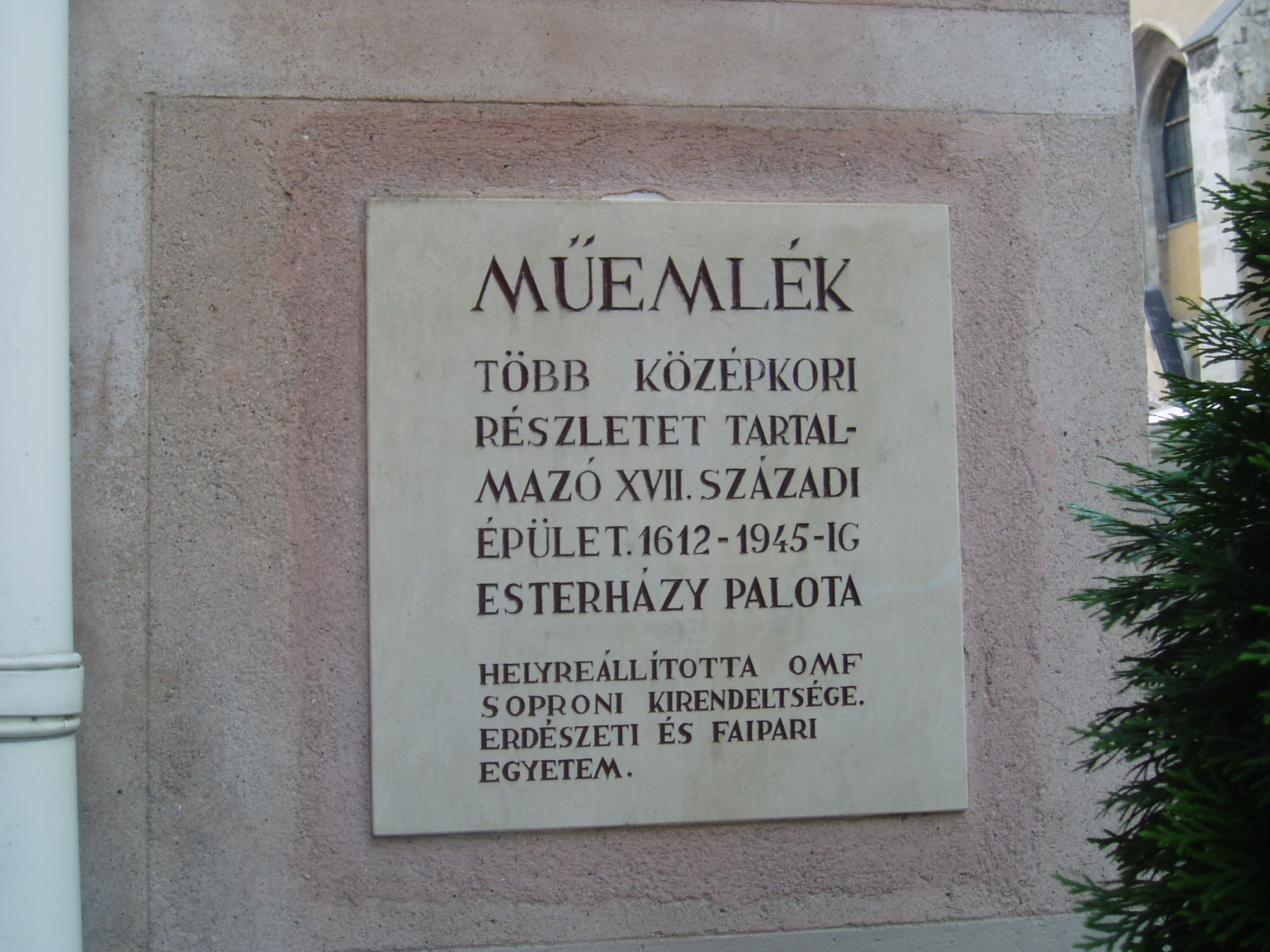 Nyilvános 1386 | 1651 | Sopron, Templom utca 4. Esterházy-palota | A Templom utca 2. számú házhoz hasonlóan ez a középkori eredetű épület is az Esterházy család tulajdona volt 1614-től egészen 1945-ig, előtte pedig Oláh Miklós, a neves humanista érsek családjáé volt. A XVII. századból a kapu és az udvari loggia őrződött meg; homlokzata, amely mintegy folytatása a másik Esterházy–palotának, a XVIII. század közepéről származik. Ebben az épületben állapították meg 1921-ben az antanthatalmak megbízottjai a Sopron és környékének sorsát eldöntő népszavazás eredményét. Az evangélikus templom harangozója hallotta meg elsőként a polgárok közül a jó hírt, s ő kezdte el örömében a harangozást, amihez azután Sopron többi temploma is csatlakozott. A kép 2008 júniusában készült. Felh. irod.: Czellár Katalin: Sopron. 3. jav. kiad. Bp. Panoráma, 2000 |