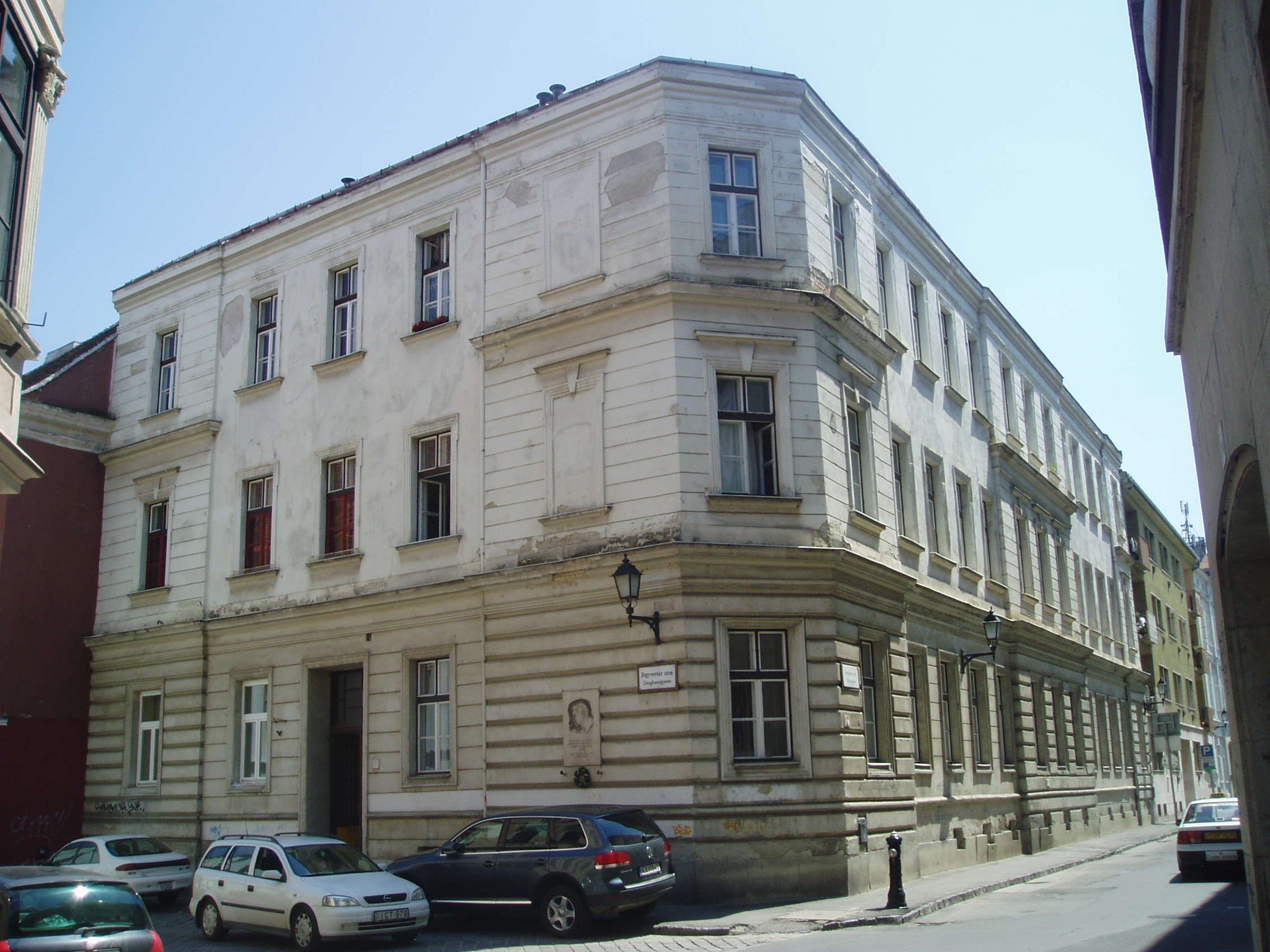 Nyilvános 1383 | 2090 | Templom utca 23. | Egykor ezen a helyen állt a neológ zsinagóga, amelyet Schámár János épített neoreneszánsz stílusban. Első és utolsó rabbija dr. Pollák Miksa (1868-1944) volt, aki történészként megírta a soproni zsidóság történetét. A mostani lakóházat Winkler Oszkár tervezte, 1960-ban épült fel. A neológ zsinagóga emléktáblája mellett az épületen egy másik tábla Pap Károly író alakját idézi fel, aki 1897. szeptember 24-én itt született, Pollák Miksa fiaként. A magyar irodalom egyik legeredetibb hangú prózaírója a buchenwaldi haláltáborban pusztult el. A kép 2008 júniusában készült. Felh. irod.: Czellár Katalin: Sopron. 3. jav. kiad. Bp. Panoráma, 2000 Hegedűs Géza: A magyar irodalom arcképcsarnoka. Bp. Trezor, 1992 |