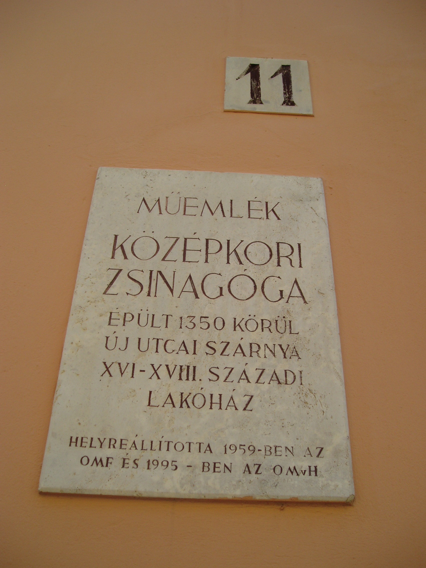 Nyilvános 1345 | 1629 | Sopron, Új utca 11. | A középkori eredetű lakóház középkori zsinagógát rejt. Az első zsidók a XIII. században települtek be Sopronba. 1370 körül épült ez az imaházuk, egy Izrael nevű bankár magánzsinagógájaként. A többször átalakított épület egyszerű barokk homlokzatának bal oldalán nyílik a kosáríves kapuzat, amelyen át beléphetünk a középkori templomba: elsőként egy utcára nyíló, boltozatos terembe, majd innét magába a zsinagógába. A két emelet magas termet kétszakaszos keresztboltozat fedi. A keleti falba mélyül az Áron-fülke, azaz a frigyszekrény. A kép 2008 júniusában készült. Felh. irod.: Czellár Katalin: Sopron. 3. jav. kiad. Bp. Panoráma, 2000 |