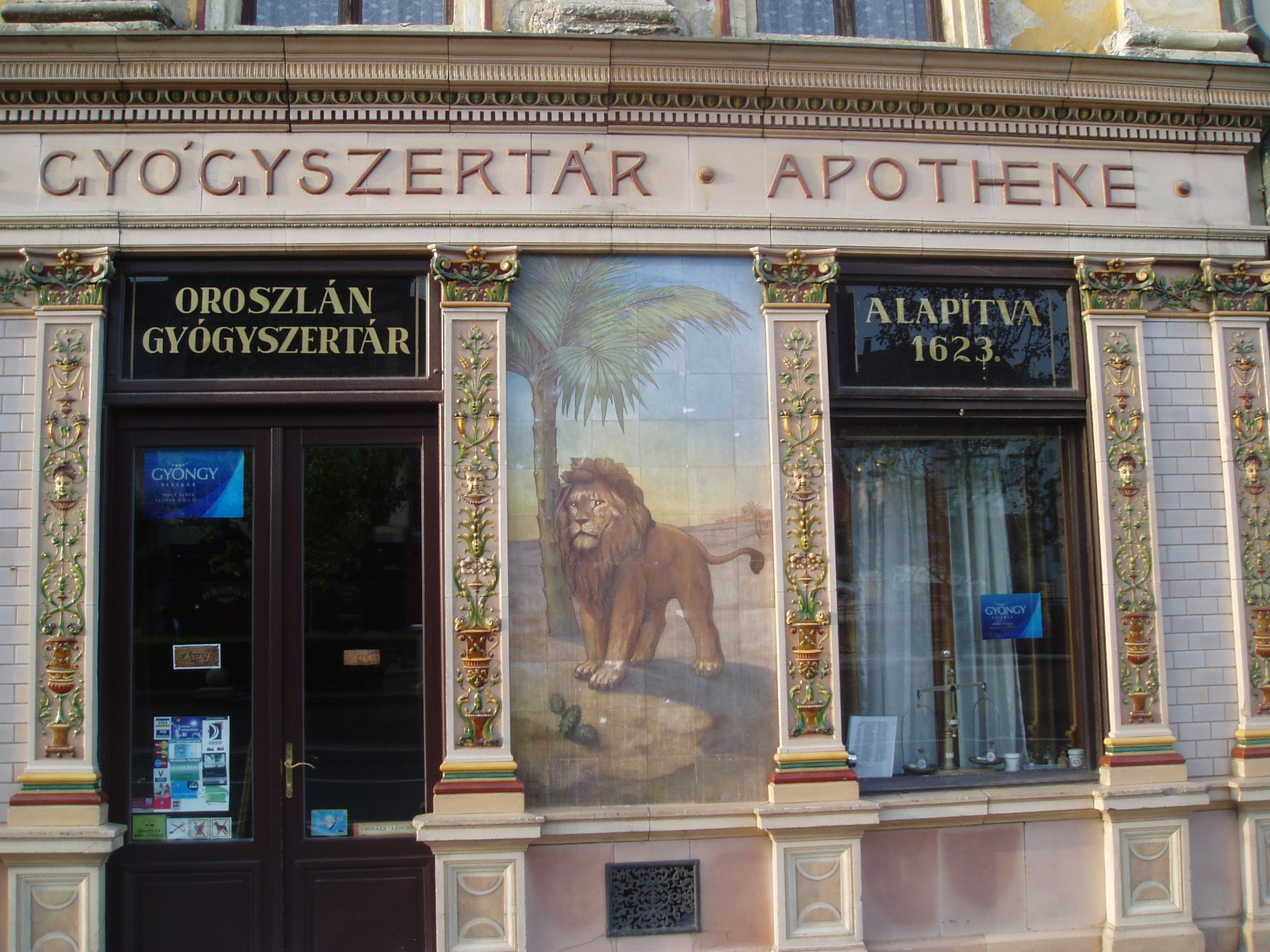 Nyilvános 1021 | 1520 | Sopron, Várkerület 29. Patikaház | A barokk lakóház patikáját a XVII. században alapították Arany Sas néven, de csak 1824-től működött ebben az épületben, ekkor már mint Arany Oroszlán gyógyszertár. Jelenlegi alakját 1750 körül kapta. Berendezését Fend János soproni asztalos készítette az 1880-as években. Majolika portálja a pécsi Zsolnay-gyár terméke a XX. század elejéről. A kép 2008 júniusában készült. Felh. irod.: Czellár Katalin: Sopron. 3. jav. kiad. Bp. Panoráma, 2000 |