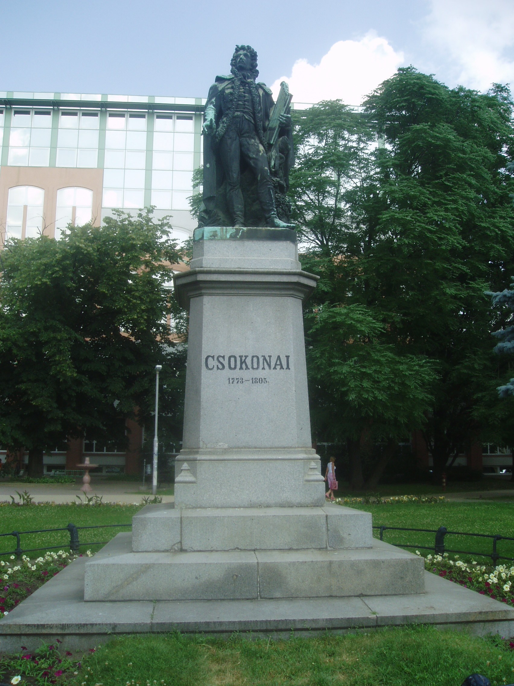Nyilvános 1244 | 2103 | Debrecen, Kálvin tér: Csokonai Vitéz Mihály szobra | A Kálvin tér ékessége Izsó Miklós Csokonai Vitéz Mihályt ábrázoló, 1867-ben készült romantikus szobra. A magas márvány talapzaton álló és arccal a Kollégium felé tekintő szobor szakértői vélemények szerint az egyik legszebb köztéri szobor Magyarországon. A szobor magyaros ruhában, zsinóros mentében, lanttal a kezében, szőlőtőke mellett jeleníti meg az anakreoni dalok költőjét, mintegy az ihlet pillanatában. A művész eredetileg vékonyabb testalkatúnak mintázta Csokonait (ez a gipszvázlat a Kollégiumban található), de a terv nem nyerte el a debreceni cívisek tetszését, mondván, hogy ilyen sovány ember nem élhetett Debrecenben... A fénykép 2006 júniusában készült. Felh. irod.: Papp Antal: Debrecen. Bp. Panoráma, 1976 Kovács Gergelyné: Debrecen. Bp. Panoráma, 1981 |