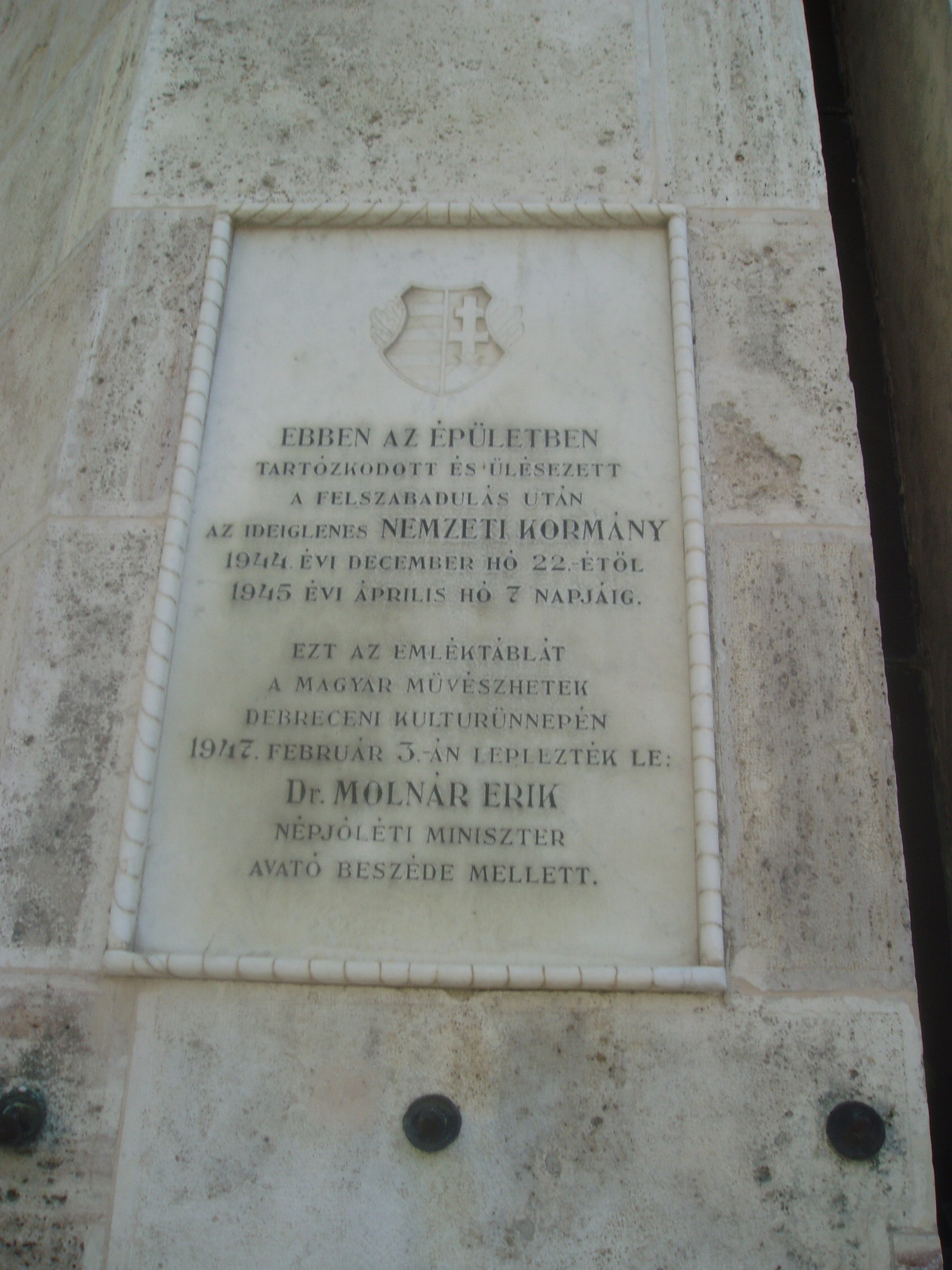 Nyilvános 1112 | 1666 | Debrecen, Kossuth utca 12-14. | A Csokonai Színház mellett, a mostani épület helyén egykor Komáromi Csipkés György (lásd: Debrecen, Bocskai út. Köztemető: Komáromi Csipkés György sírja) főbíró háza állott. 1711-ben az ő fedele alatt folytak a szatmári békét előkészítő tárgyalások. Ma itt a Pénzügyi Palota hatalmas épülettömbje áll, amelyet 1911-12-ben építettek Bobula János tervei szerint. Homlokzatát a második emelet felett domborművek díszítik: a búzatábla előtt álló, kaszát tartó, zsákot hordó és más tevékenységeket végző alakok a munka erejét hirdetik. Az épület homlokzatán emléktábla örökíti meg, hogy 1944/45 telén itt volt az első független magyar kormány székhelye. A fénykép 2006 júniusában készült. Felh. irod.: Kovács Gergelyné: Debrecen. Bp. Panoráma, 1981 |