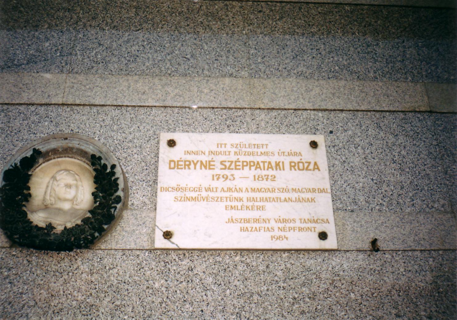 Nyilvános 1557 | 3564 | Jászberény, Lehel vezér tér 28. | A Lehel Vezér tér és a Déryné utca sarkán modern épület áll. Déryné utcai oldalán egy 1984-ben állított emléktábla olvasható: ITT SZÜLETETT INNEN INDULT KÜZDELMES ÚTJÁRA DÉRYNÉ SZÉPPATAKI RÓZA 1793-1872 DICSŐSÉGGÉ VÁLT AJKÁN A MAGYAR SZÓ, A MAGYAR DAL, SZÍNMŰVÉSZETÜNK HALHATATLANJÁNAK EMLÉKÉRE JÁSZBERÉNYI VÁROSI TANÁCS HAZAFIAS NÉPFRONT 1984 Itt, az OTP jászberényi székházának helyén állt egykor Déryné édesapja, Scheckenbach József patikája. Scheckenbach József Hatvanból települt Jászberénybe, s feleségül vette az özvegyen élő, több gyermekes Riedl Ninát. Két gyermekük született: 1793. december 24-én Róza, majd 1798-ban Johanna, aki később szintén színésznő lett, bár tehetségében messze elmaradt nővérétől. Scheckenbach (a szakirodalomban mindenütt olvasható Schenbach-hal szemben ez volt az apa vezetékneve) több próbálkozás után megvásárolta az itt levő telket egy rajta álló kis házzal. Patikaházát, Jászberény első gyógyszertárát ennek helyére, több menetben ő maga építette. Első része 1794 nyarán készült el, amit egy év múlva tovább bővített. Déryné idős korában papírra vetett emlékezéseiben ezt a házat nevezte meg szülőházaként. A városi hivatalos iratok fényében ez nem helytálló (elképzelhető, hogy a mai Margit utcában született), viszont az igaz, hogy kicsi gyermekkorától itt lakott, legkorábbi emlékeinek helyszíne ez a patikaház volt. A különc patikus — mivel a remélt fiú helyett kislánya született — Rózát fiúnak akarta nevelni. Három éves korától fiúruhában járatta; elképzelése az volt, hogy fiúként iratja majd be az orvosi egyetemre, hogy utódja legyen. Miután második lánya, Johanna is megszületett, Scheckenbach fiatalon, harminc éves korában meghalt. Az özvegy nehéz anyagi helyzetbe került, s végül el kellett adnia a patikát. Édesanyjától hallott Róza először színházról mesélni, s már ezek a mesék olthatatlan vágyat keltettek a kislányban. Az özvegy édesanya hamarosan Pestre vitte lányát német szót és varrást tanulni. A baráti házaspár, akiknél elhelyezte Rózát, a később Mátray Gábor néven ismertté vált muzsikus és zenetörténész szülei voltak. Ekkor látott először igazi színházi előadást. Nem minden nehézség nélkül, de sikerült a színi pályára kerülnie, s vált belőle prózai és zenés színháztörténetünk legendás alakja. S idős korában papírra vetett Emlékezései révén a magyar szépirodalomba is beírta nevét. Felh. irod.: Déryné Széppataki Róza: Déryné emlékezései. Bp. Szépirodalmi Kiadó, 1955. Karcsai Kulcsár István: Így élt Déryné. Bp. Móra Kiadó, 1978 |