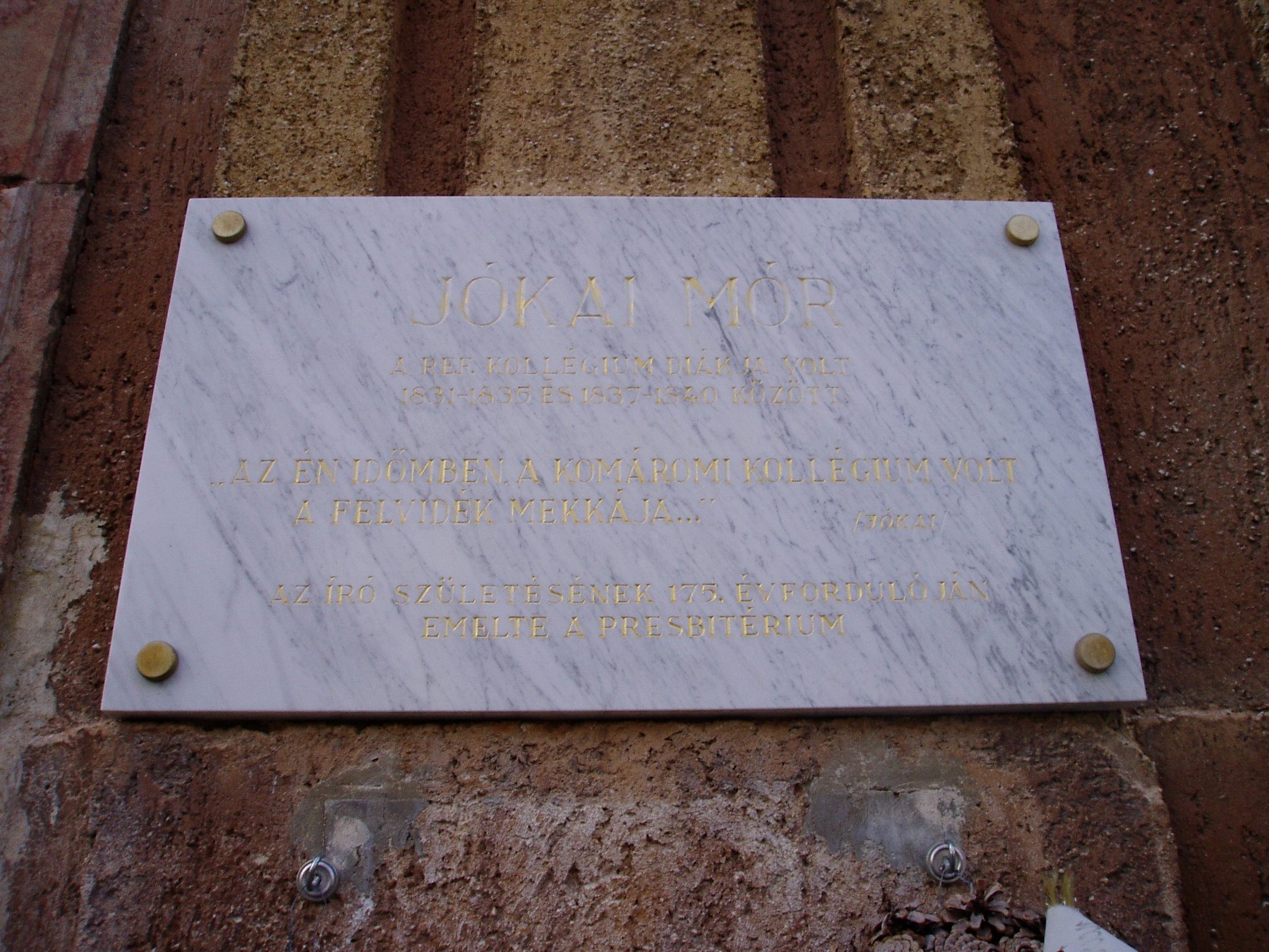 Nyilvános 1892 | 4125 | Komárom (Komárno), Jókai u. Református Kollégium, Jókai Mór emléktáblája | A református templommal szemben, tágas udvar közepén áll a volt Református Kollégium történelmi épülete. Az egyemeletes, hatalmas tetőzetű, kis bádogtornyú épület 1796. december 28-án készült el. A "múzsáknak állított" iskolaépület ünnepélyes megnyitására 1797. január 2-án került sor. A komáromi kollégium - tudós tanárai révén - rövidesen olyan hírnévre tett szert, hogy nem csupán a Komárom megyei fiatalok tanultak itt, hanem számosan a szomszédos és távolabbi megyékből is. Itt kezdett iskolába járni 1831 őszén a kis Jókai Mór is, s egy év kihagyással 1840-ig az iskola diákja volt, amelyet később a Felvidék Mekkájának nevezett. A fénykép 2005. júliusában készült. Felh. irod.: Mácza Mihály: Komárom nevezetességei. Pozsony, Madách-Posonium, 2002 |