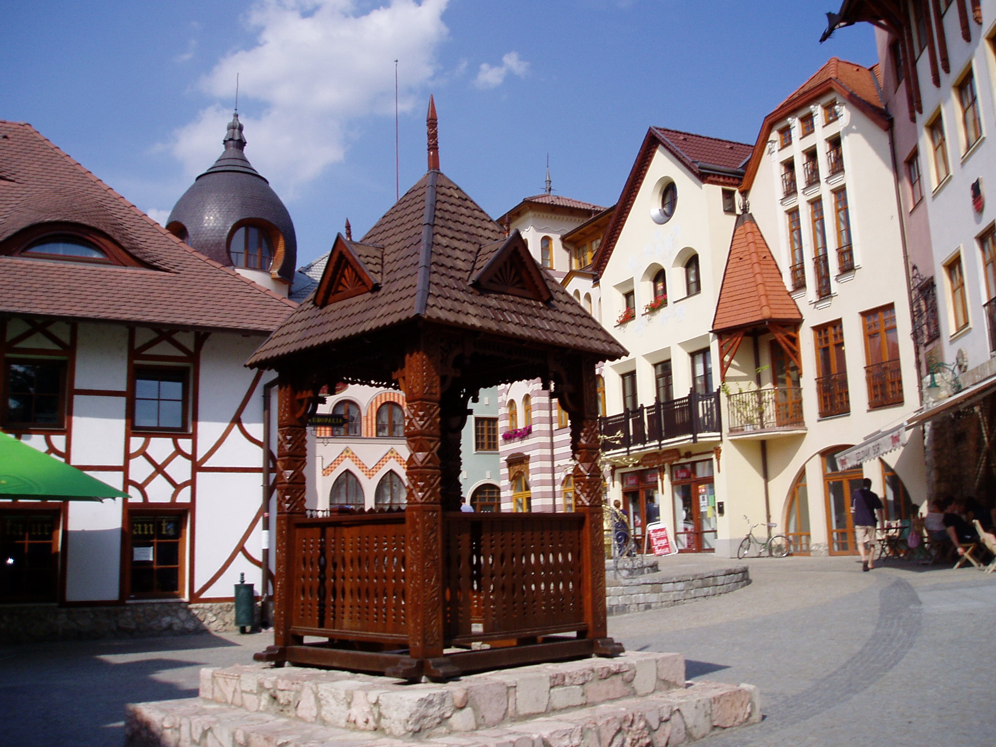 Nyilvános 1927 | 6679 | Komárom (Komárno), Európa udvar | A közelmúltban a Zichy–palota (lásd: Klapka tér 9.) udvarán építették ki az ún. Európa udvart. A helyi viszonylatban gigantikus méretű vállalkozás célja, hogy élőben mutassa be harmincöt európai ország építészetét. A városrész egyben Komárom új szolgáltató központja is, üzletekkel, éttermekkel, kávézókkal, valamint egy föld alatti bevásárlóközponttal. A fénykép 2005. júliusában készült. Felh.irod.: www.komarno.sk Mácza Mihály: Komárom nevezetességei. Pozsony, Madách-Posonium, 2002 |