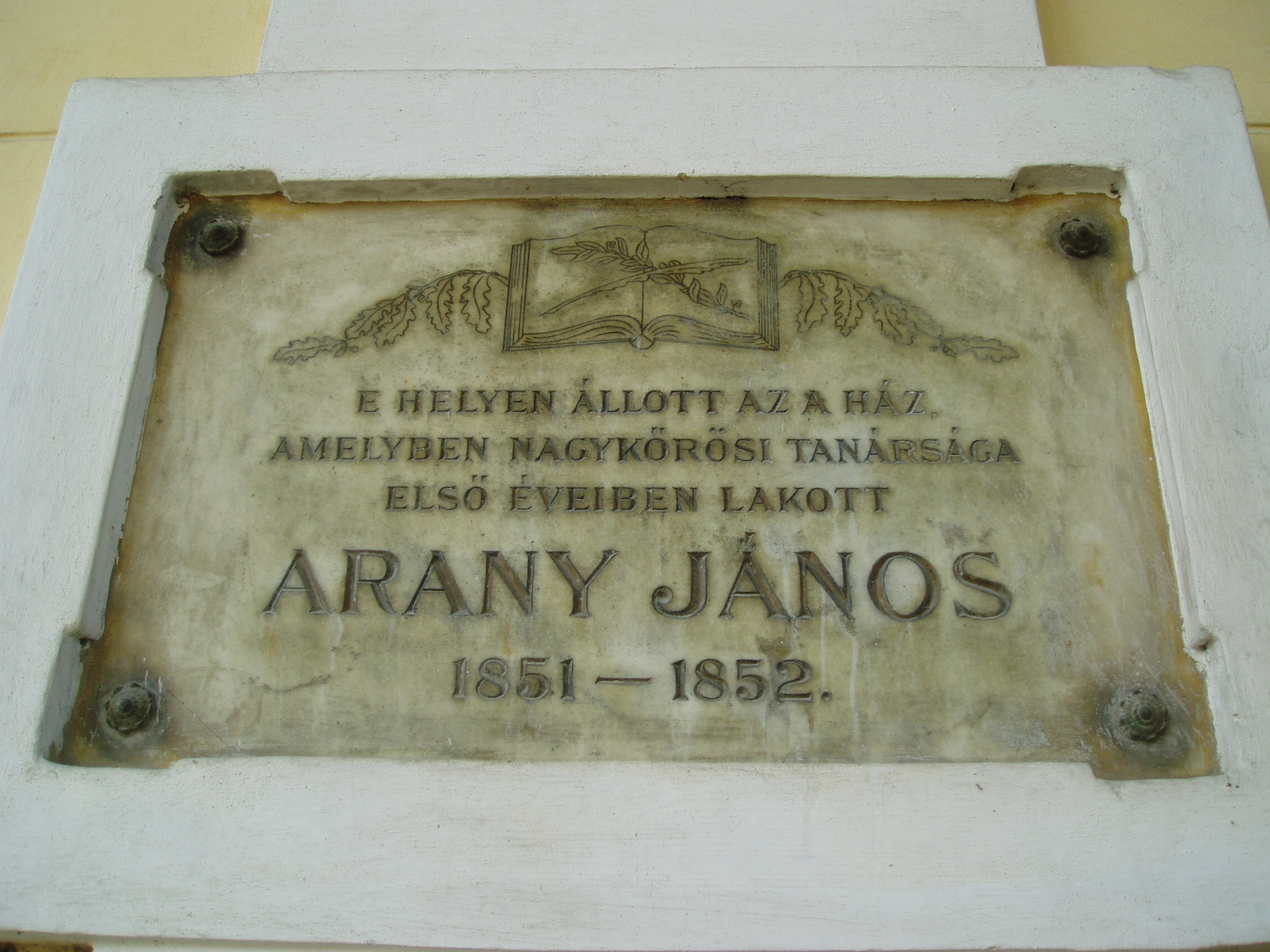 Nyilvános 2019 | 3869 | Nagykőrös, Dalmady utca 5. | Arany János 1851 és 1860 között élt és működött Nagykőrösön, magyart tanított a helyi gimnáziumban. Első lakása az ezen a helyen korábban állott házban volt. Viszonylag hamar elköltöztek innét a mai Arany János utca 27. alá egy szép kúriába, mert ez a ház csaknem rájuk rogyott... A fénykép 2006 augusztusában készült. Felh. irod.: Törös László: A nagykőrösi Arany emlékek katalógusa. = A nagykőrösi művelődés hármas kis tüköre. Nagykőrös, 1935 |