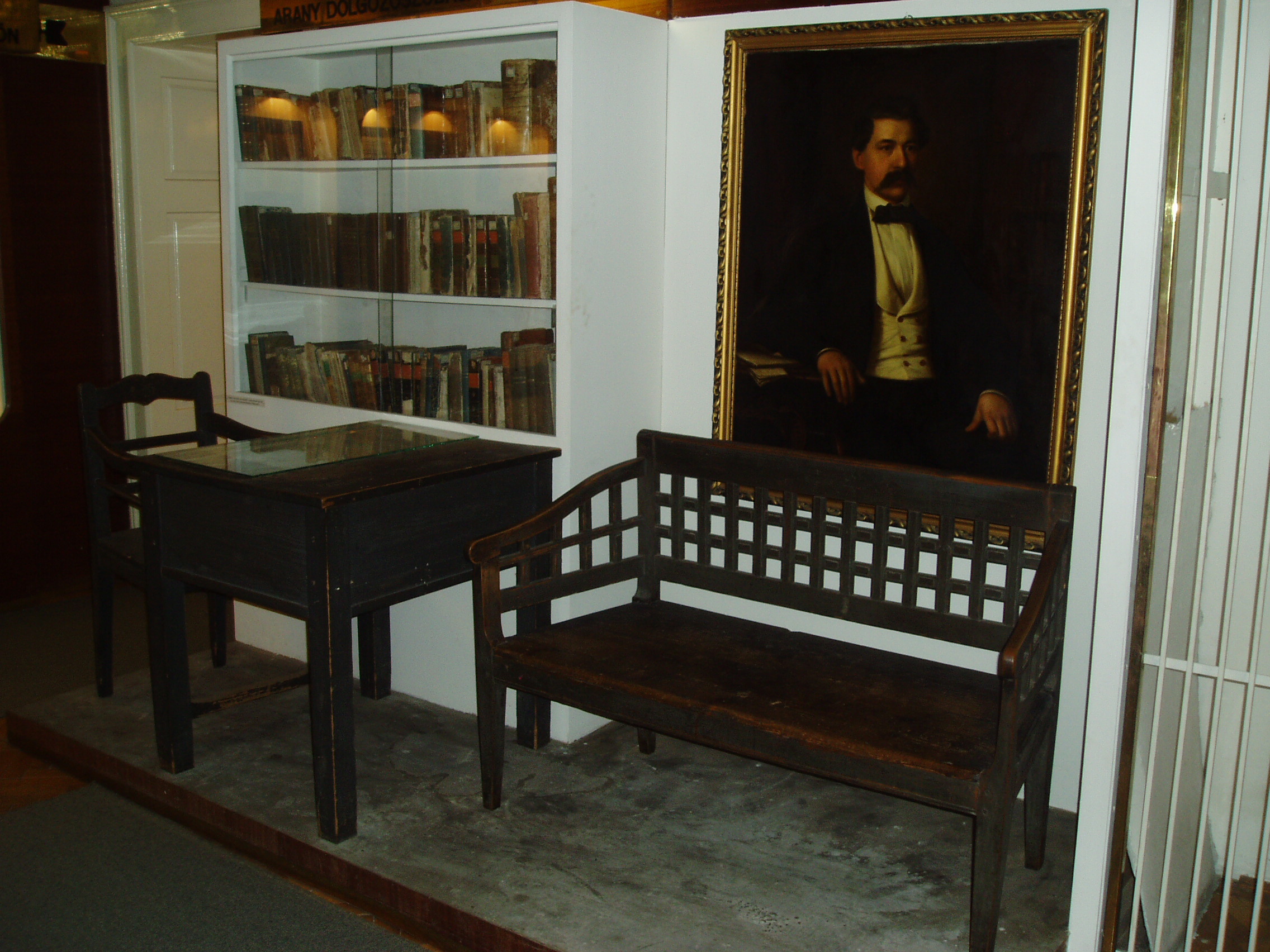 Nyilvános 1612 | 3521 | Nagykőrös, Ceglédi út 19. Arany János Múzeum | Arany János 1851 és 1860 között élt Nagykőrösön, magyart és latint tanított a helyi gimnáziumban. A városban fennmaradt s Arany halála után a családja által adományozott relikviákból 1910-ben Arany-emlékszobát rendeztek be Arany egykori működésének helyén, a gimnáziumban. Később e relikviák az 1928-ban alapított városi, Arany János Múzeumba kerültek, s ma is ott láthatók. A képen Arany János dolgozószobájának bútorai láthatók. A fénykép 2006 augusztusában készült. Felh. irod.: www.c3.hu/~pmiajm/hunnagyk.htm www.vendegvaro.hu Novák László: Arany János Múzeum. Nagykőrös, 2000 Novák László: Arany János Múzeum. Nagykőrös, 2000 Törös László: A nagykőrösi Arany emlékek katalógusa. = A nagykőrösi művelődés hármas kis tüköre. Nagykőrös, 1935 (Sajnálom, a kép nem lett túl jó, de fontossága miatt mégis feltettem: K.K.) |