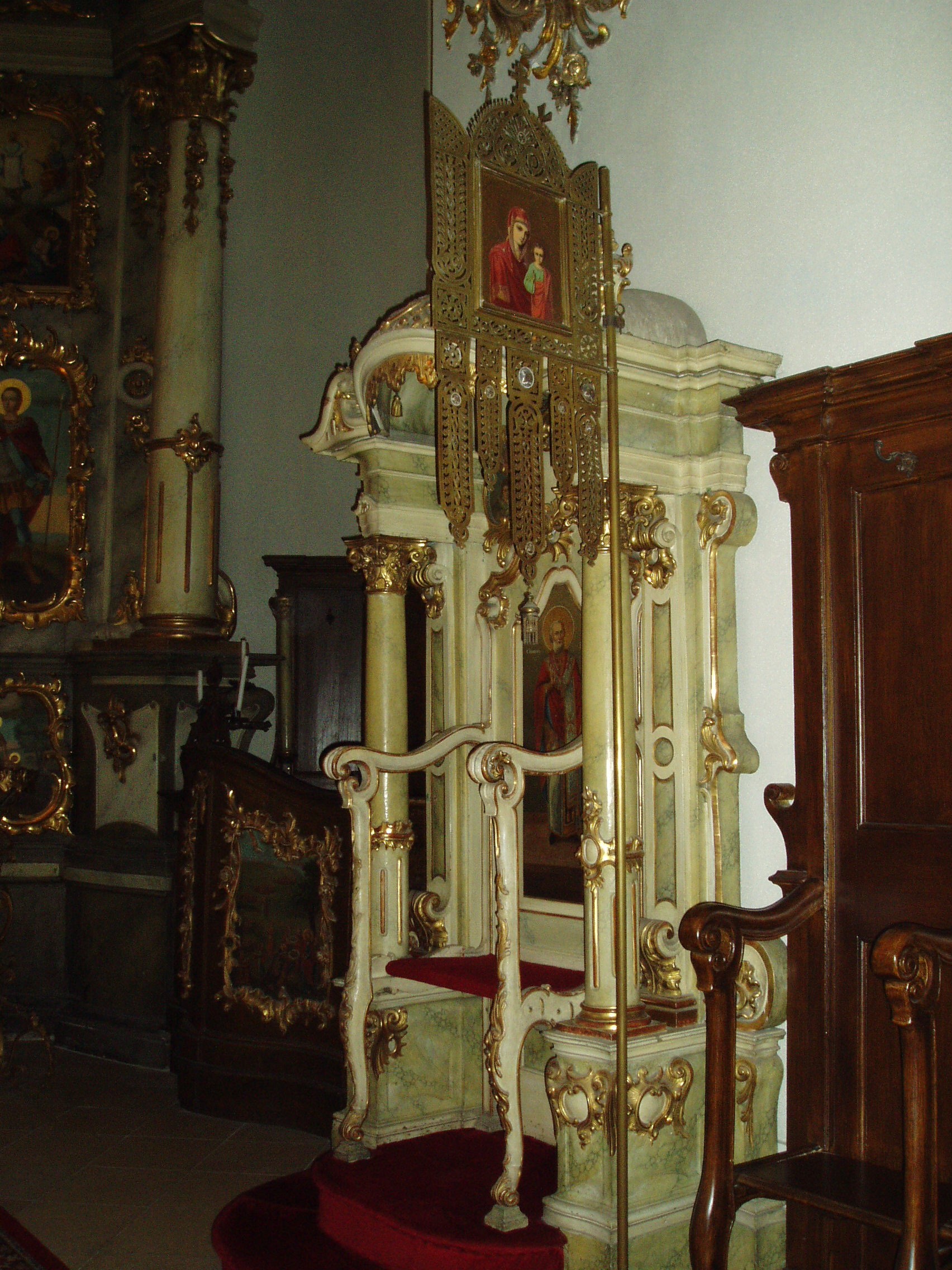 Nyilvános 1423 | 2030 | Szentendre, Pátriárka utca: Beográda-templom | A görögkeleti (ortodox) püspöki székesegyház, a Beográda vagy Belgrád-templom az ortodox egyházi élet központja. Helyén egykoron középkori templom állt, majd a XVII. században az ottani politikai helyzet miatt Belgrádból idetelepülők kőből építettek itt templomot. A mai, barokk stílusú katedrális 1756-1764 között készült. A körülzárt kertbe - amelyben a templom és mellette a püspöki palota áll - finom mívű kovácsoltvas díszkapun át juthatunk be. A templom főbejárata mellett áll az a kis épület, melyben a szájhagyomány szerint III. Arsenije pátriárka lakott, ezért azt ma is pátriárkai épületnek nevezik. A székesegyház főhomlokzatában kiemelkedő szerepet kap a 48 méter magas harangtorony; ez Szentendre legmagasabb templomtornya. A templombelső nagy művészettörténeti értéke a nagyméretű ikonosztáz (Ösztovics Vazul szerémségi festőművész készítette 1777/81-ben), az aranyozott, hársfából faragott szószék, valamint a baldachinos püspöki trón. A fénykép 2005 szeptemberében készült. Felh. irod.: Szentendre. Szerk. Sándyné Wolf Katalin. Bp. Panoráma, 1985 www.templom.hu www.vendegvaro.hu |
