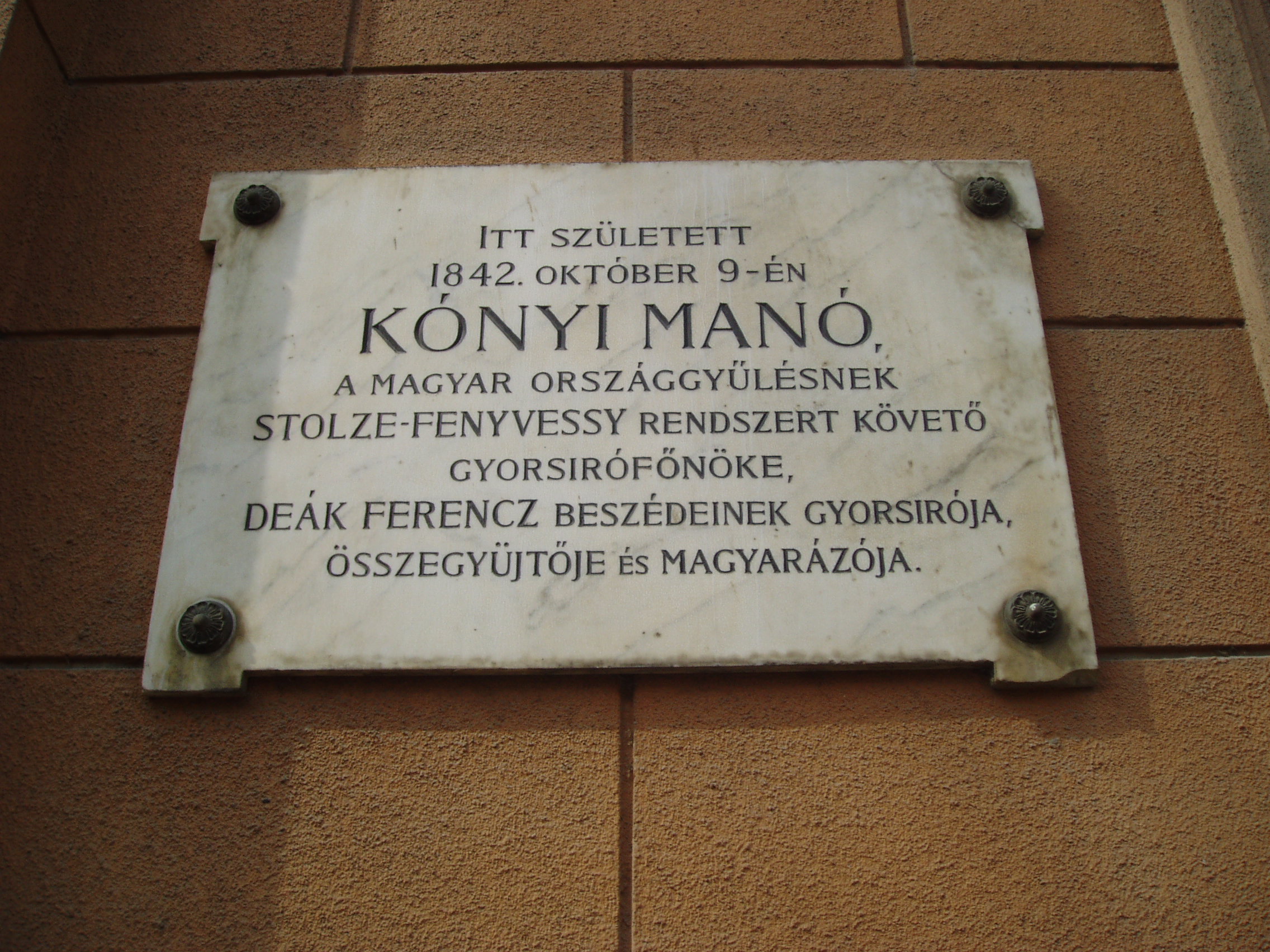 Nyilvános 1144 | 1833 | Kaposvár, Kossuth tér 5. | Az egykori Erzsébet szálló épületét 1901-ben hat hónap alatt készítették el. A sarokerkély feletti saroktorony, valamint a színes Zsolnay-cserepek a városközpont egyik jellegzetes épületévé teszik. A Noszlopy Gáspár utca felőli homlokzaton Kónyi Manó emléktáblája olvasható, aki a szálló helyén korábban állott épületben született. Szövege a következő: "Itt született 1842. október 9-én Kónyi Manó, a magyar országgyűlésnek Stolze-Fenyvessy rendszert követő gyorsírófőnöke. Deák Ferenc beszédeinek gyorsírója, összegyűjtője és magyarázója." A fénykép 2006 márciusában készült. Felh. irod.: Látnivalók Somogy megyében. Miskolc, Well-PRess, 2000 |