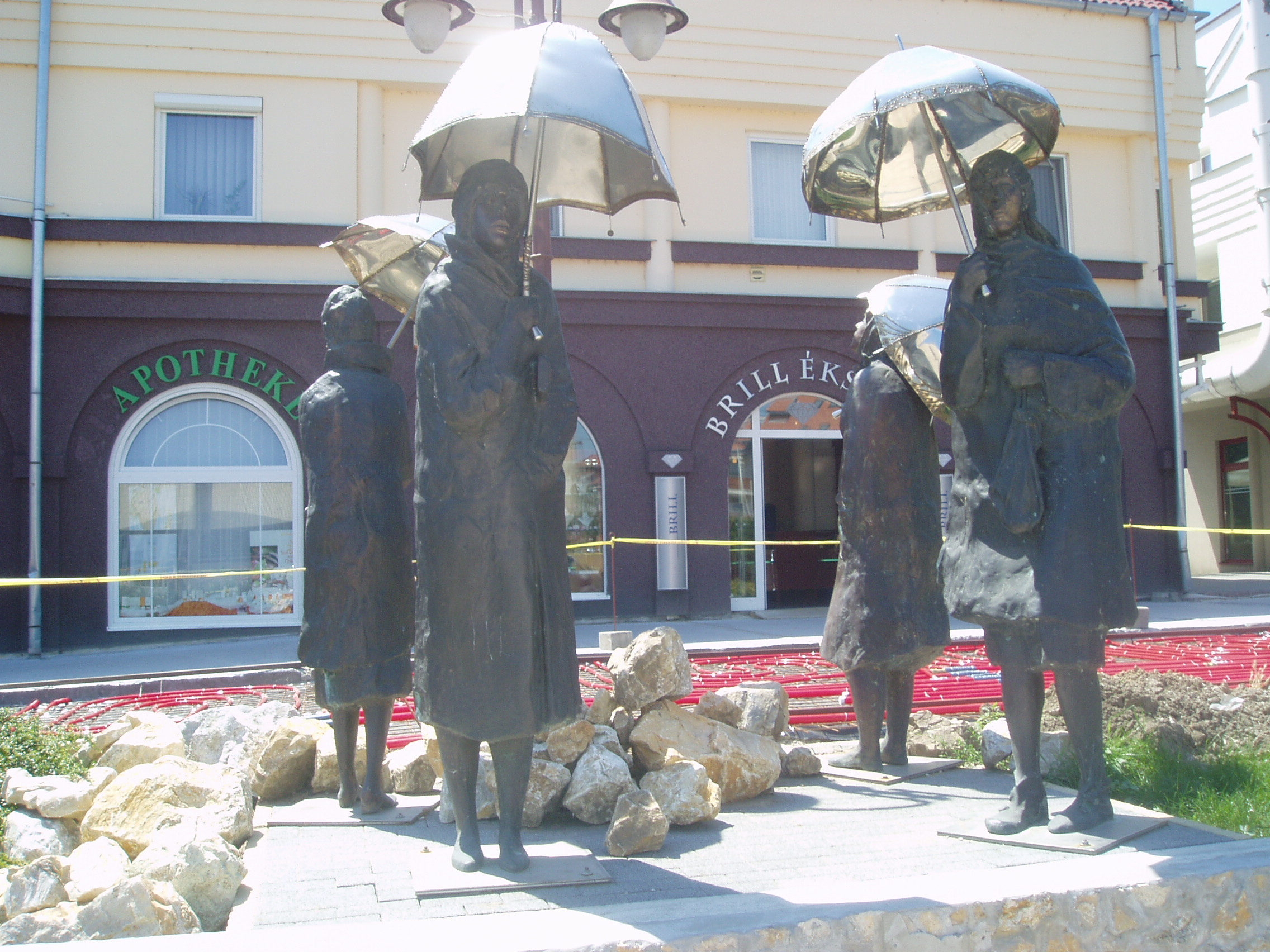 Nyilvános 1243 | 4098 | Siófok, Fő tér: Varga Imre: Várakozók | Varga Imre szobrászművész 1923. november 1-jén született Siófokon. Már gyermekkorában - a siófoki elemi iskolában - rendkívül jó rajzkészségével tűnt ki. 13 évesen szerepelt egy képével Párizsban. A képzőművészet terén elért kimagasló érdemeiért, amellyel Magyarország és Siófok város hírnevét is öregbítette, 1985-ben ő lett Siófok város első díszpolgára. Hazai és külföldi tereken, templomokban, középületekben mintegy 300 alkotását helyezték el. Szobrai állnak Belgiumban, Franciaországban, Lengyelországban, Németországban, Norvégiában és Izraelben. Siófokon a Fő téren szabadtéri szoborkiállítása látható. Az itt lévő Várakozók című szoborkompozíciójának - amelyet gyakran neveznek Esernyősök-nek is - eredetije Óbudán, kétalakos változata pedig Los Angelesben van. A fénykép 2006 júliusában készült. Felh. irod.: http://www.siofok.com/uj/object/varga-hu.html |