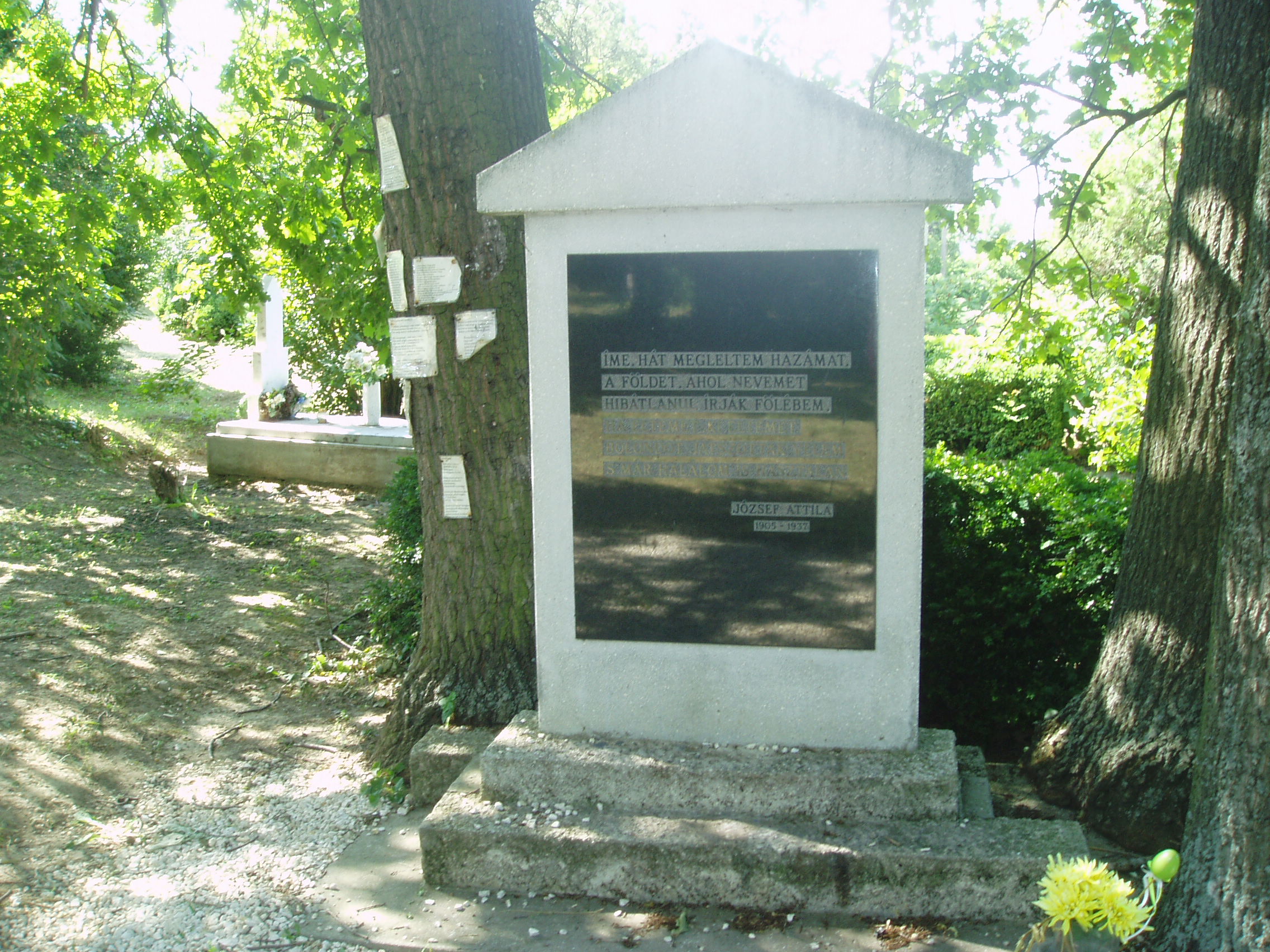 Nyilvános 1892 | 16349 | Balatonszárszó, Temető: József Attila eredeti sírja | A Balatonszárszón elhunyt József Attilát a község ún. régi temetőjében temették el. (Megközelíthető a József Attila utcát keresztező Petőfi utcán balra, észak felé fordulva, a kereszteződéstől kb. 5-6 percnyi sétával.) Az egyik szemtanú, Faludy György így emlékezett a temetésre: "Találtunk egy református papot, mert görögkeleti nem volt a közelben. A falu népe kijött az öngyilkoshoz, a sír másik oldalán a maroknyi barát, kolléga. Elmondtam egy verset, amit a temetésre írtam. Az egész olyan szomorú és nyomasztó volt, mint Attila rövid életének szinte minden pillanata, ami végül már elviselhetetlenné vált számára." Versben pedig 1996-ban így fogalmazta meg: József Attila emlékmű Szárszón, 1 Huszan se voltunk ötvenkilenc éve. Lejöttünk, hogy Attilát eltemessük Szárszón. A téli nap kegyetlen fénye, porhó, kékség. Az országúton együtt vártunk. A kanyarban most temetési menet látszott közeledni. Az élen a plébános, hatalmas, öreg férfi. "hát ezek kik?" tudakolta kevélyen s vaskos, veres hüvelykjét felénk bökte. "Pesti urak," szólt a ministráns lágyan. "Ők egy bolond temetésére jöttek." Utánuk néztünk, nem gondoltunk rosszat. Tudtuk, bolondok vagyunk mindahányan, akik egy jobb világról álmodoznak. A költő 1942-ig nyugodott itt. Sírja ma a Kerepesi temetőben van - ez már negyedik nyughelye (!). Szárszói, később készült temetői emlékkövén az "Íme, hát megleltem hazámat" kezdetű, valószínűleg utolsó versének sorai olvashatók. De még meghatóbbak azok a kézzel írt versidézetek, amelyeket az ide látogatók a környező fák törzsére tűztek fel... A fénykép 2007 júniusában készült. Felh. irod.: www.balatonszarszo.hu www.szarszoitalalkozo.hu www.mult-kor.hu |
