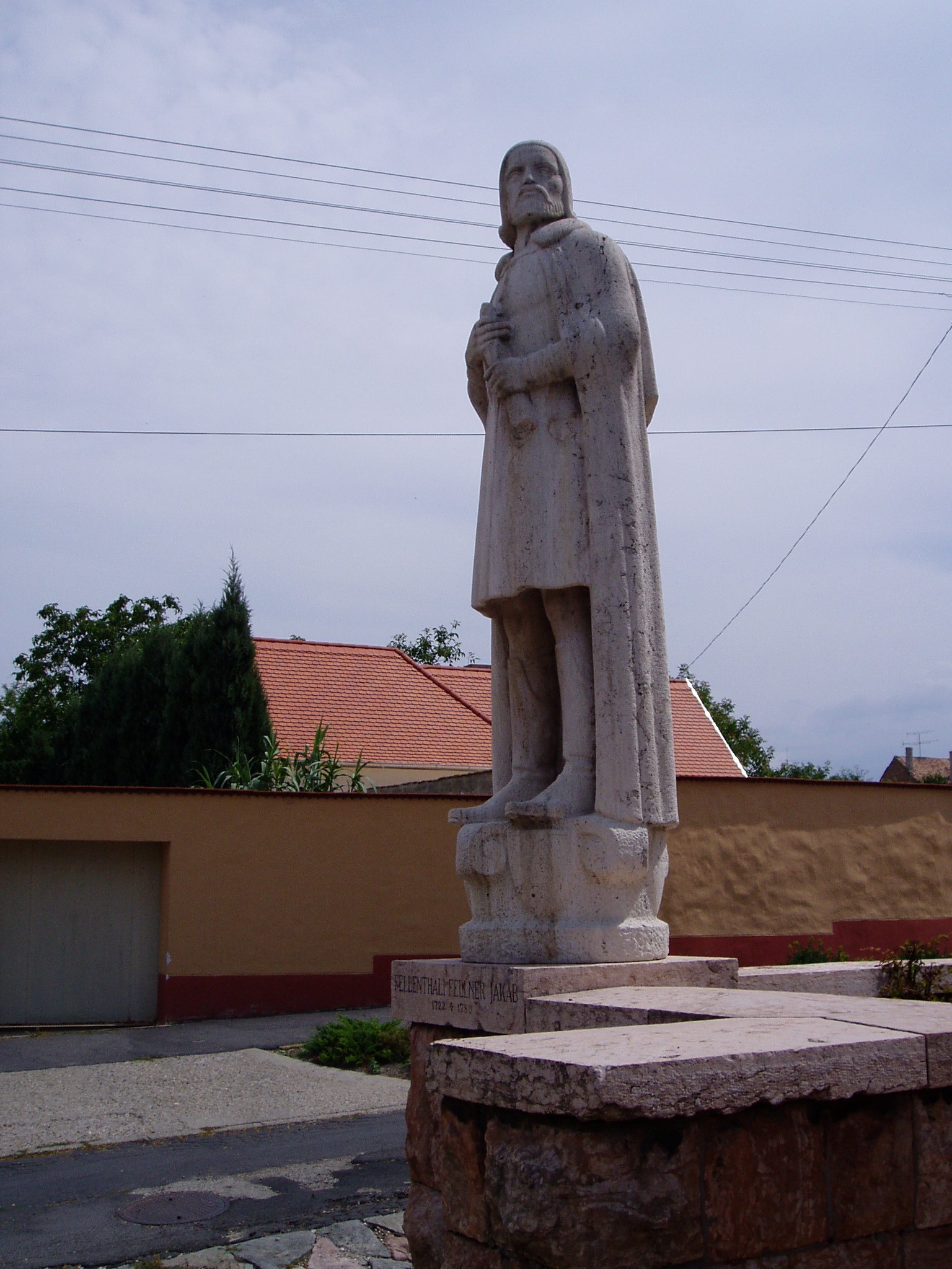 Nyilvános 1529 | 3176 | Tata, Kossuth tér: Fellner Jakab szobra | A római katolikus templom mellvédjén helyezték el Fellner Jakab szobrát, Ungvári Lajos alkotását (1940). Fellner Jakab (1722-1780) a maga erejéből vált az egyik legkiválóbb magyar építésszé. 1745-ben telepedett le Tatán, ahol kisebb-nagyobb megszakításokkal egészen haláláig élt. Főleg az Esterházy grófok számára dolgozott, majd szakmai jó hírének köszönhetően másoktól is sok megbízatást kapott. Jelentős szerepe volt Tata, Pápa, Eger és Veszprém városképének kialakításában. A templom Franz Anton Pilgram által elkezdett építkezését ő folytatta, de befejezését már nem érhette meg. Saját kérésére e templom kriptájában temették el. A fénykép 2005. júliusában készült. Felh. irod.: Látnivalók Komárom-Esztergom megyében. Miskolc, Well-PRess, 2003 Magyar életrajzi lexikon |