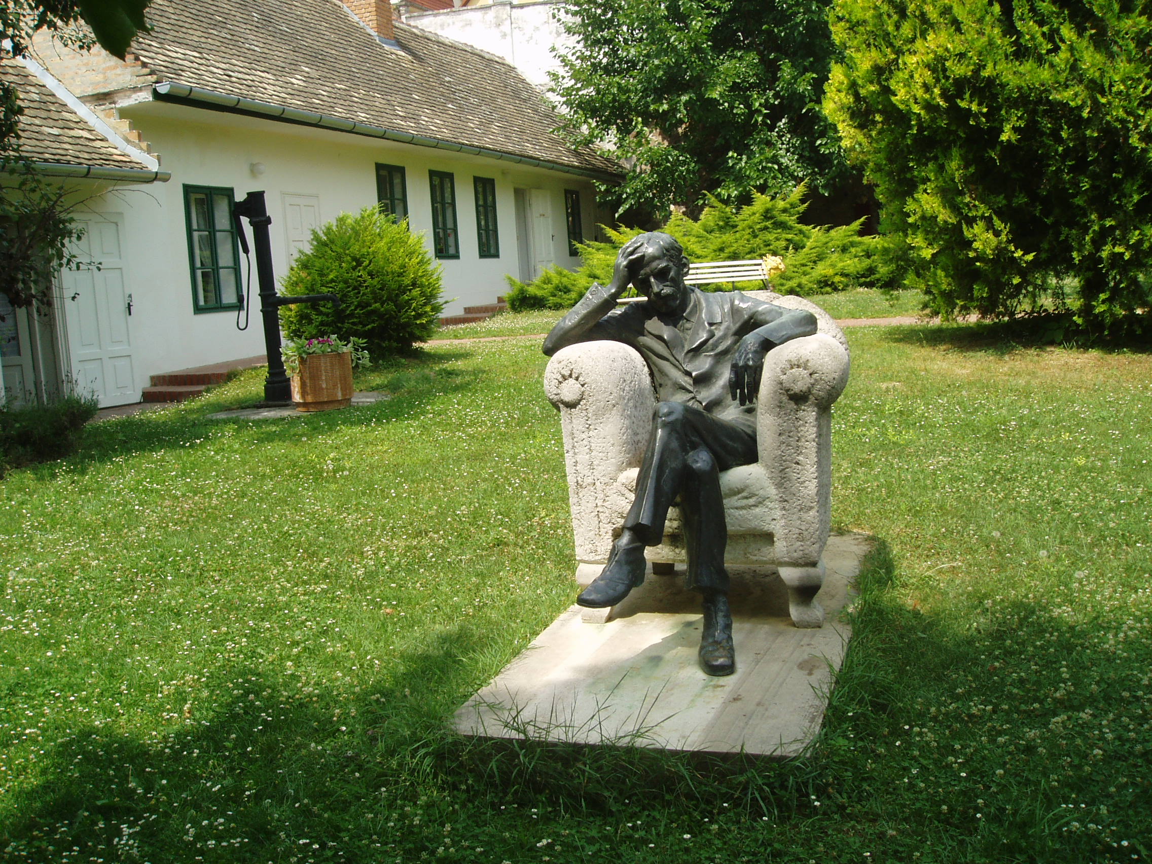 Nyilvános 1609 | 3616 | Szekszárd, Babits Mihály utca 13. Babits Mihály Emlékház | Babits Mihály egyemeletes, copf stílusú szülőháza a XIX. század elején (egyes források szerint 1780 körül) épült az akkor a város védőszentjéről Szt. Lászlónak nevezett utcában. A költő anyai nagyapja 1852-ben, szekszárdi letelepedésekor vásárolta meg. Itt született a költő 1883. november 26-án, s sokat tartózkodott és alkotott ezen a helyen. 1967-ben rendezték meg a házban az első emlékkiállítást, amelyet 1983-ban, a költő születésének centenáriumán újjáalakítottak, s az egész épületet emlékháznak rendezték be. A költő relikviái, a család bútorai, használati tárgyai és dokumentumai mellett láthatók Farkas Pál, Rippl-Rónai József, Glatz Oszkár és Beck Ö. Fülöp Babitsot ábrázoló képzőművészeti alkotásai is. Babits Mihály számos verse itt született, és itt játszódik a Halálfiai című regény több fejezete is. Az épület udvarán 1981-ben avatták fel Babits Mihály szobrát, Farkas Pál alkotását. A töprengő költő szobra a szülőház elválaszthatatlan része lett. Babits szülőházában állandó kiállítás idézi a szintén szekszárdi születésű Dienes Valéria filozófus és Baka István költő, író emlékét. A fénykép 2006 júliusában készült. Felh. irod.: www.szekszard.hu www.museum.hu Töttős Gábor: Babits bölcsői körül. = Tolna Megyei Levéltári Füzetek 6. Szekszárd, 1977 |