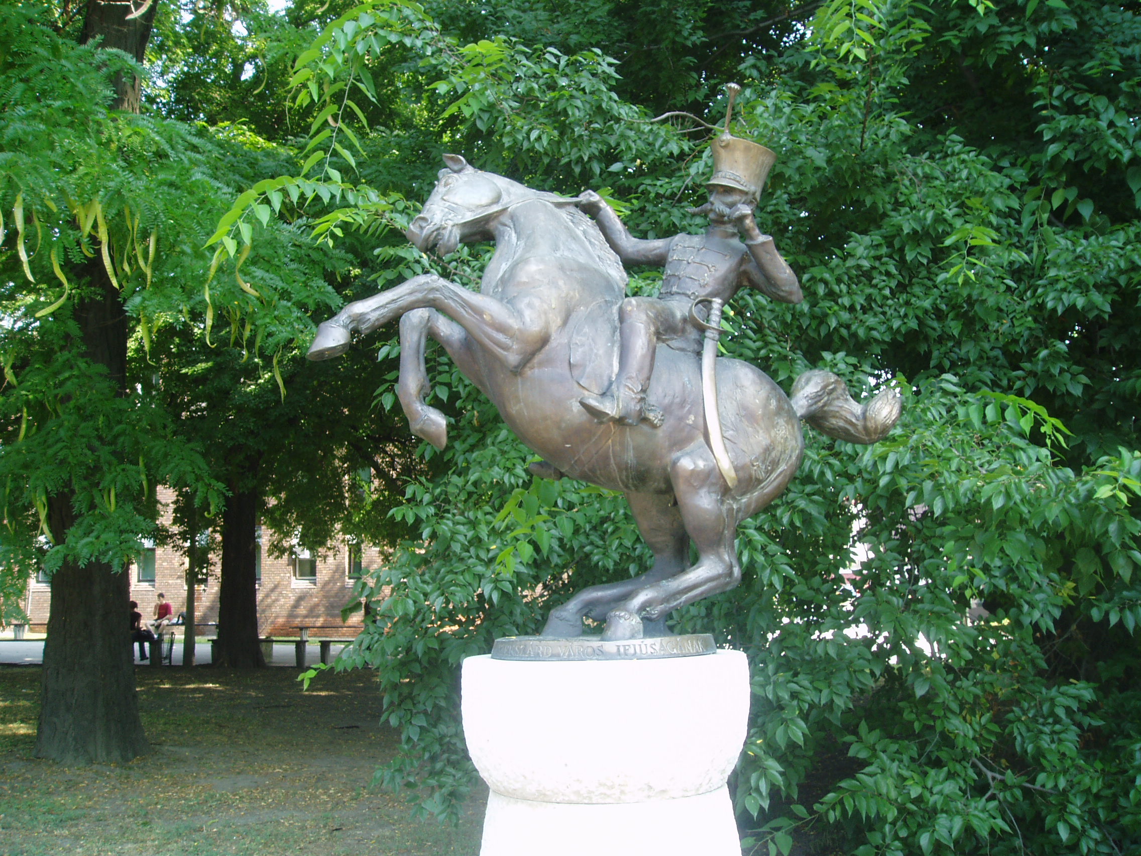 Nyilvános 1223 | 2736 | Szekszárd, Liszt Ferenc tér: Háry János szobra | A szekszárdi születésű (lásd: Szekszárd, Széchenyi u. 40.) Garay János, majd később Kodály Zoltán által halhatatlanná tett mesehős, Háry János szobra a Szekszárdon élő Farkas Pál alkotása. Felállítását dr. Joó Ferenc adománya tette lehetővé 1992-ben. A helyi hagyomány szerint a szobor háta mögötti Augusz-házban (lásd: Szekszárd, Széchenyi u. 36-38.) szolgált az az egykori katona, akiről Garay Háry János alakját mintázta. A fénykép 2006 júliusában készült. Felh. irod.: http://www.szeki.hu/turista/kalauz/magyar/tuka0201.htm Töttös Gábor: Szekszárd. Bp. Panoráma, 1986 Töttös Gábor: Irodalmi séták Szekszárdon. 1985 |