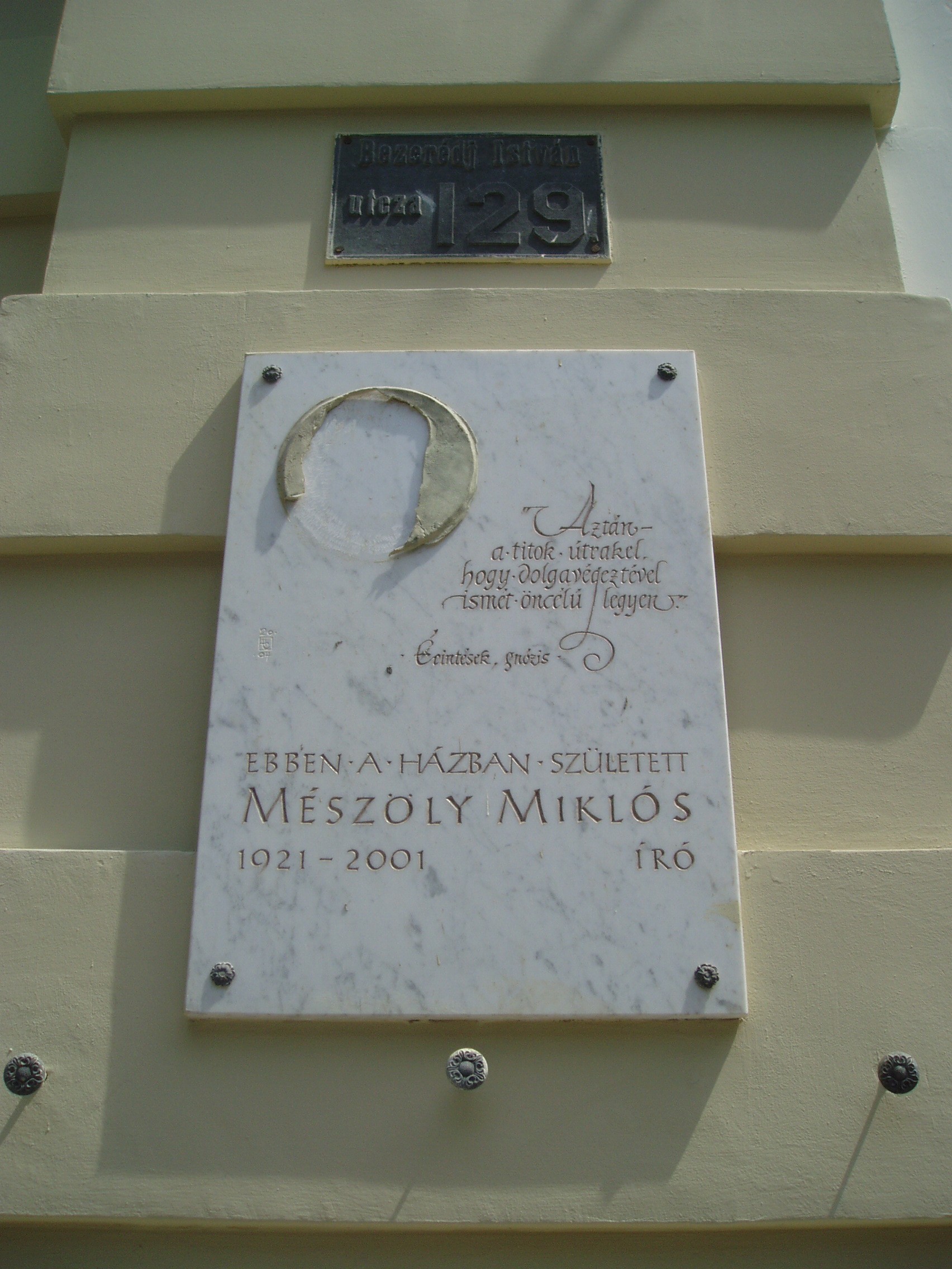 Nyilvános 1143 | 1815 | Szekszárd, Bezerédj utca 2. | Ebben a házban született 1921. január 19-én - Molnár Miklós néven - Mészöly Miklós író, költő (2001-ben hunyt el Budapesten). Emléktábláját 2004. január 19-én avatták fel özvegye, Polcz Alaine jelenlétében (az író portrédomborműve sajnos már hiányzott róla, amikor 2006. nyarán lefényképeztem - K. K.). 2005 januárjában Babits Mihály szülőházának szomszédságában, a Babits Mihály utca 15. számú házban megnyitották az "Irodalom Háza - Mészöly Miklós Múzeum" elnevezésű intézményt. A múzeumot a Polcz Alaine által Szekszárd városának ajándékozott hagyatékból rendezték be. A kiállítás valósághűen idézi fel Mészöly Miklós és Polcz Alaine budapesti lakásának két részletét. Az antik bútorokkal berendezett könyvtárszobában az író nagy biedermeier íróasztala áll, rajta évtizedekig használt írógépe. A zsúfolt könyvespolcok felett a barátok által ajándékozott festmények, művészeti reprodukciók láthatók. A puritán kis háló-dolgozószobában erdélyi csergével borított ágya. Mellette lóg a falon a szekszárdi borrend medálja, a Demokratikus Charta 1992. szeptember 4-i nagygyűlésének belépőkártyája és egy amerikai emlék. Egyszerű íróasztala felett megsárgult fotók, képek. A falakon körben könyvekkel megrakott polcok sorakoznak. A két szobában együtt több mint 2500 kötet látható az író tekintélyes könyvtárából. A fénykép 2006 júliusában készült. Felh. irod.: www.szekszard.hu |
