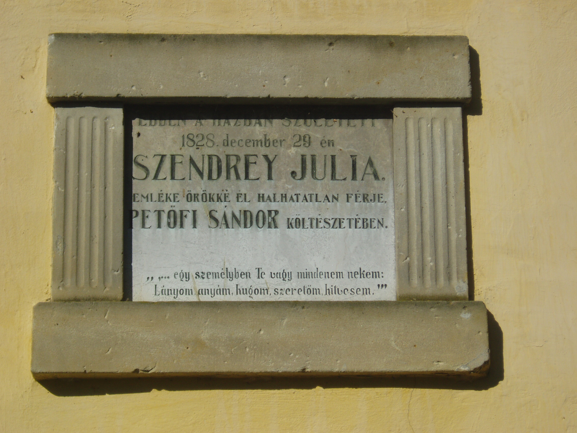 Nyilvános 1327 | 2862 | Keszthely, Szendrey telep: Szendrey Júlia szülőháza | A keszthelyi temetőtől délre, az egyetem új épületei között vezet az út Újmajorba, amelyet ma Szendrey telepnek hívnak. XVIII-XIX. századi házak állnak itt, amelyek egykor a Festetics uradalomhoz tartoztak. Az egyik épületen 1909-ben emléktáblát helyeztek el, ugyanis itt született 1828. december 29-én Szendrey Júlia. Apja, Szendrey Ignác ez időben a Festetics uradalom tiszttartója volt, de hamarosan elkerült innét a család Erdélybe. Szendrey Júlia 1846-ban ismerkedett meg Petőfivel, 1847-ben kötöttek házasságot. Kisfiuk, Zoltán a szabadságharc idején Debrecenben született (lásd: Hajdú-Bihar megye: Debrecen, Batthyány u. 16.). Férje halála után Júlia Horváth Árpád egyetemi tanár felesége lett. 1868. szeptember 6-án, 39 éves korában Pesten halt meg. Lapokban, folyóiratokban néhány költeménye, prózai írása és naplójának részletei jelentek meg. 1856-ban Magyarországon Andersen meséit először az ő fordításában olvashatták magyarul. Keszthelyen utca, iskola is viseli nevét. A Goldmark Károly Művelődési Ház előcsarnokában 1983-ban elhelyezték emléktábláját. Szendrey Júlia szülőházával szemben egy másik egykori intézői ház található, amelyen Bartók Béla emlékét idézi márványtábla, aki 1906-ban, egyik korai népdalgyűjtő útján szállt meg itt. A felvétel 2006 októberében készült. Felh. irod.: Látnivalók Zala megyében. Miskolc, Well PRess, 1999 Zalai életrajzi kislexikon. = http://zalai.dfmk.hu/zalaiak |