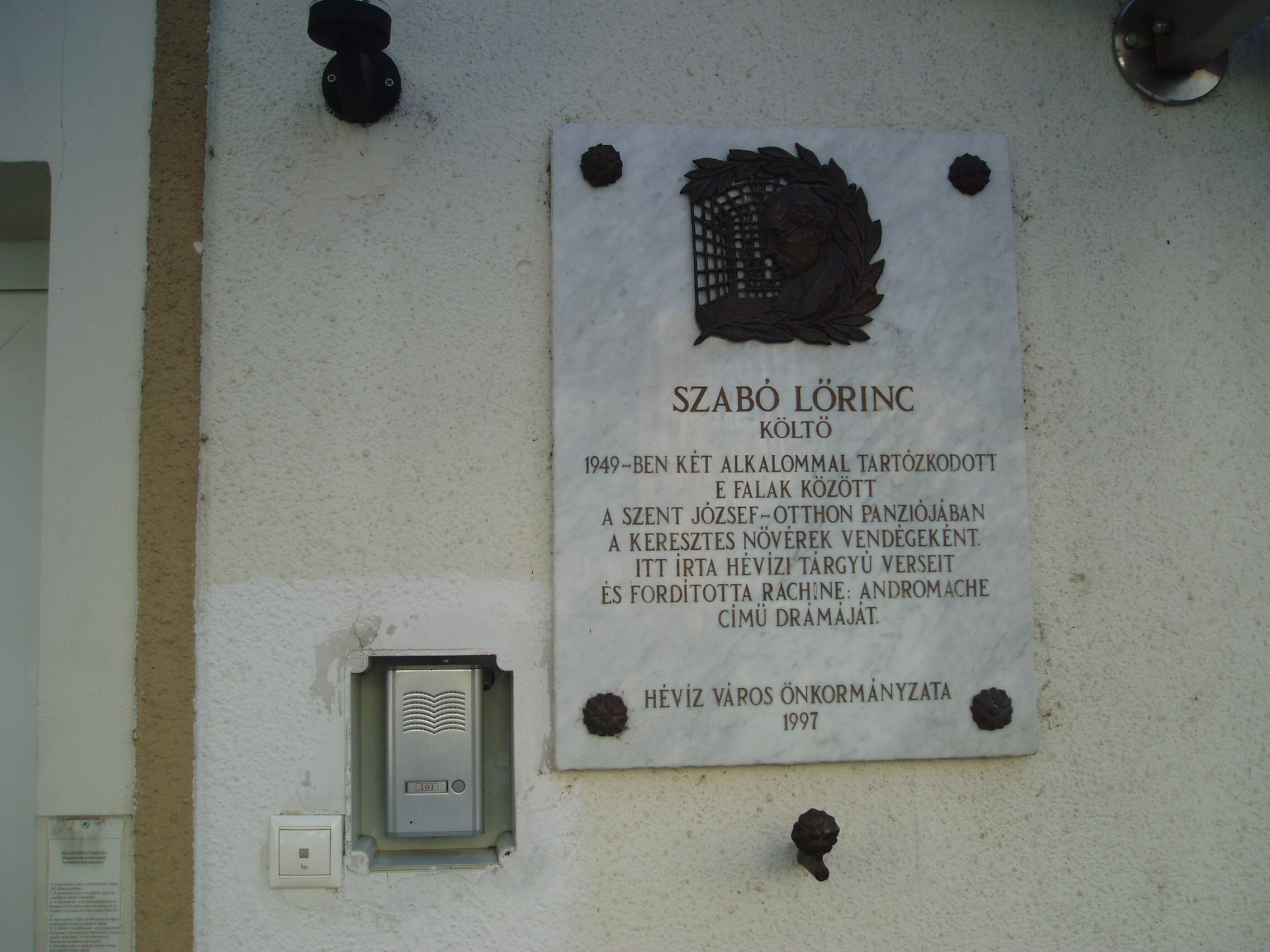 Nyilvános 1402 | 2722 | Hévíz, Erzsébet királyné utca 5. | Mint az épület homlokzatán elhelyezett emléktáblán is olvasható, Szabó Lőrinc 1949-ben két alkalommal tartózkodott e falak között. Több verse született ebben a házban, amely akkor a Szent József-Otthon panziója volt, s svájci eredetű apácarend tagjai, ún. keresztes nővérek vezették. Egyik itt írt verse, amely a Kádfürdő címet viseli, az itteni víz gyógyító hatásáról szól, kedélyes archaizálással: A kádi víz nem tündér szerető, cirógat bár, jóféle ápoló csak; hát még a kenet, mit kintről a tónak fő-titkú (s még szerintem se merő pokolsárkány-ganéjból eredő) sarából tsúzra száz éve pakolgat s delejsugárnak-minek mond maholnap a tudományos, modern feredő! E víz, mondom, nem tündér, nem bohó; vén csap okádja, véneknek való. Tüstént jelzik gyöngyzúzos szőreink, jővén, sava dicséretes fokát, s ha mégy, már szívből szólsz rá vissza, mint ténsúr Berzsenyi tette, hogy: Vivát! A felvétel 2006 októberében készült. Felh. irod.: Horányi Károly: Szabó Lőrinc utazása. = www.kortarsonline.hu/0607/horanyi.htm |