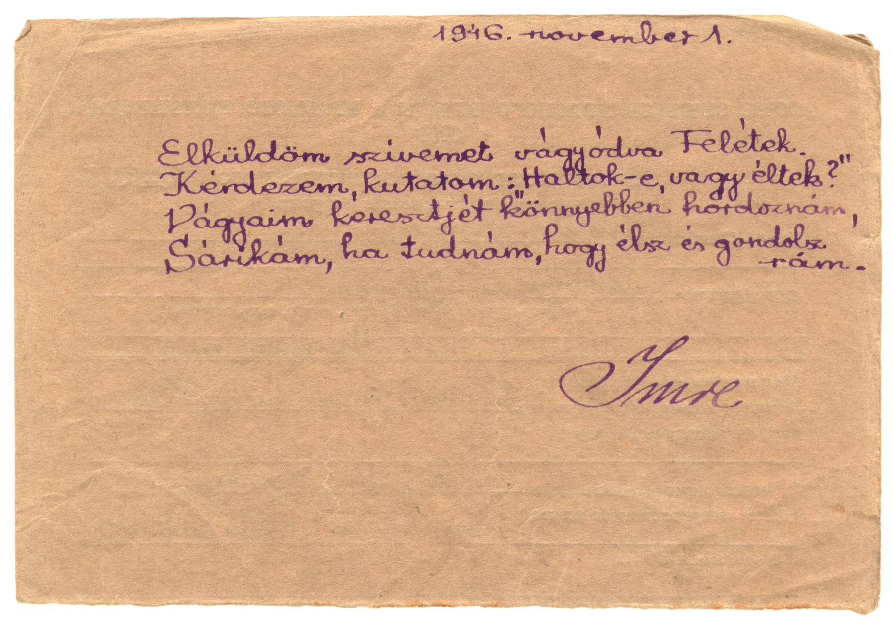 Nyilvános 1374 | 2502 | Vértes Imréné | Letenye Zala vm. Magyarország Vértes Imre hdgy. hdf. C.C.C.P. "Moszkva" Vöröskereszt, Postafiók 430/1. c. 1946. november 1. Elküldöm szívemet vágyódva Felétek. Kérdezem, kutatom: "Haltok-e, vagy éltek?" Vágyaim keresztjét könnyebben hordoznám, Sárikám, ha tudnám, hogy élsz és gondolsz rám. Imre |