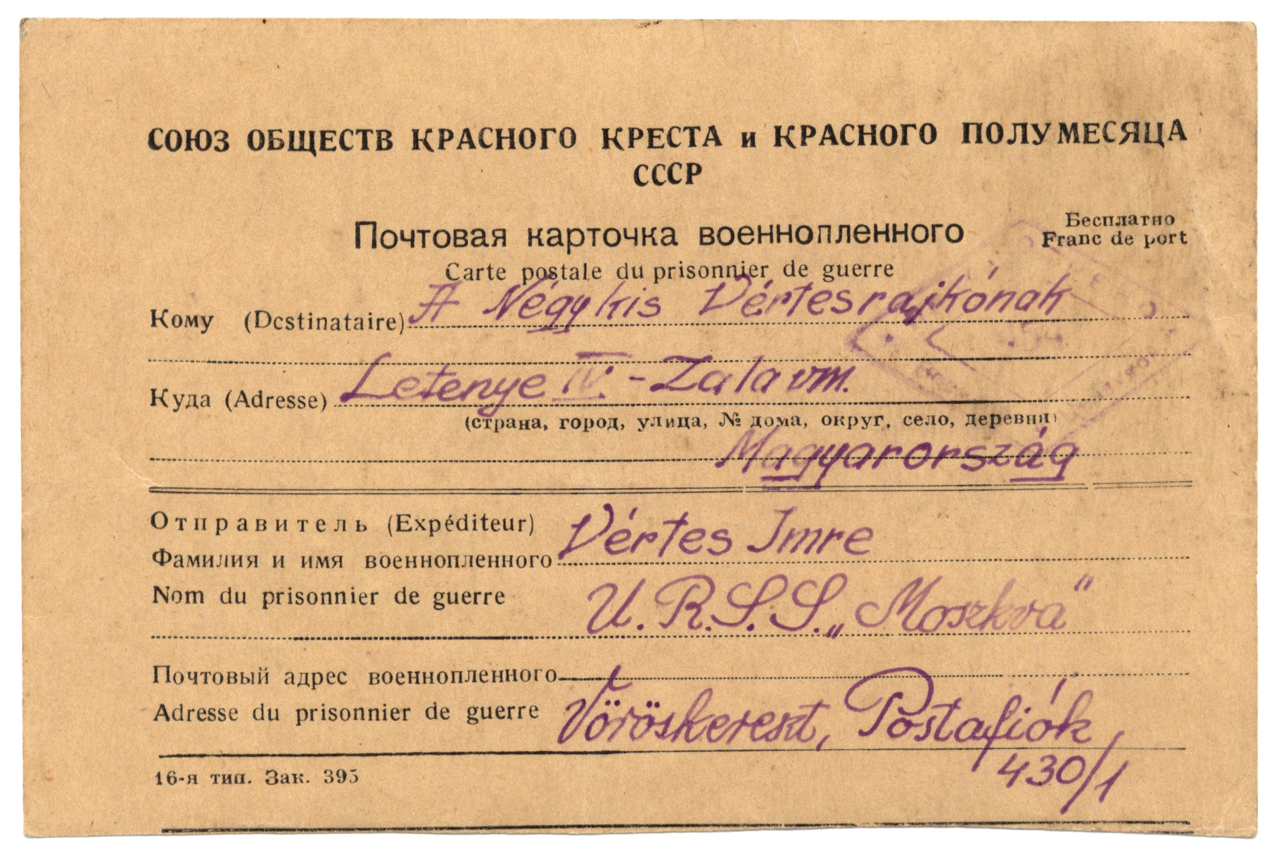 Nyilvános 1330 | 2323 | A Négy kis Vértesrajkónak | Letenye IV. - Zala vm. Magyarország Vértes Imre U.R.S.S. "Moszkva" Vöröskereszt, Postafiók 430/1. c. 1947. II. 10. Kicsiny fészek, benn négy fecske, Élő fészek élő kincse: Négy fióka; négy kis lélek Gellért, Jutka, bennem éltek, Eszter, Györgyi: Kicsi fecskék, Rátok szállnak álomlepkék Attól, akit hazavártok, Éj-nap, aki gondol Rátok. Messzeszakadt Apukátok |